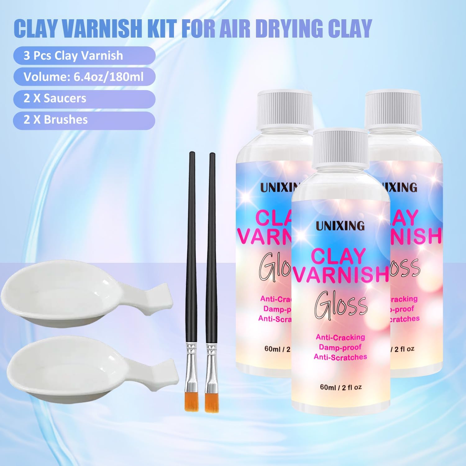 - Package includes:60ML X 3Pack Air Dry Clay Varnish (180ml in total), 2Pcs brushes, 2Pcs saucers