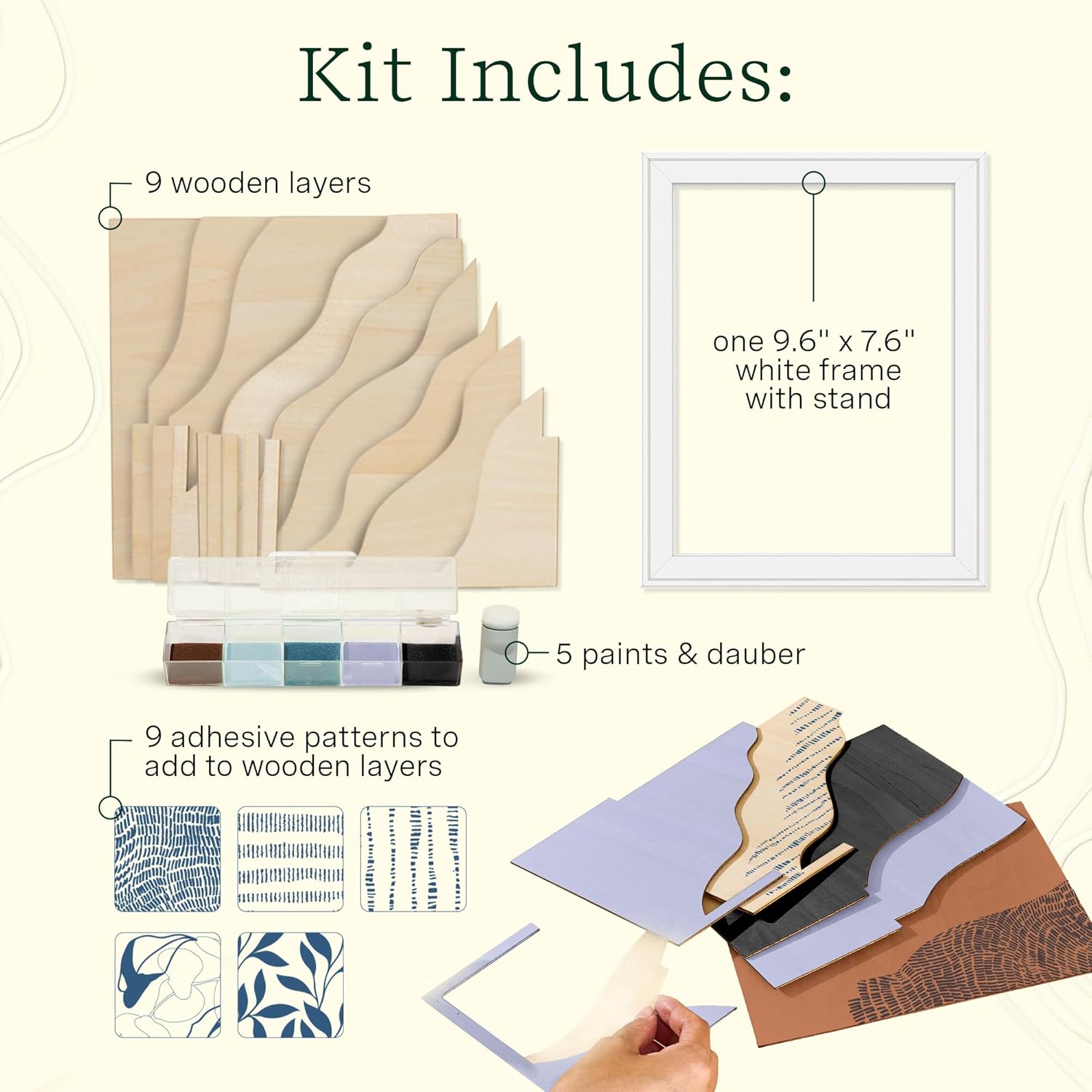 - Kit Includes: Everything you need to create a stunning framed wooden art piece. Includes 9 wooden layers, 5 paints & dauber, 9 adhesive patterns to add to wooden layers, and one 9.6" x 7.6" white frame with stand.