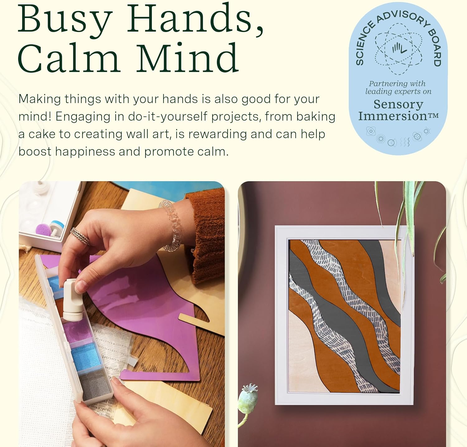 - Busy Hands, Calm Mind: Making things with your hands is also good for your mind! Engaging in do-it-yourself projects, from baking a cake to crafting beautiful wall art, is rewarding and can help boost happiness and promote calm.