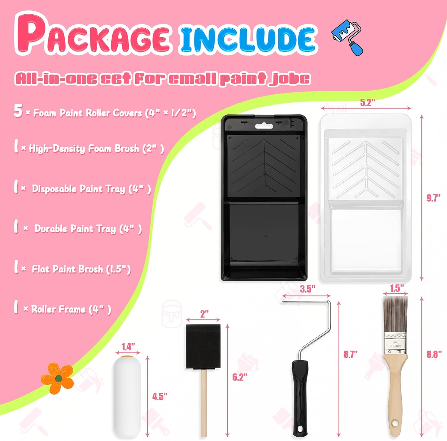 - 10-Piece Paint Roller Set: Includes 4 inch high density foam paint roller covers x 5, sturdy roller frame x 1, paint tray x 1, tray liners x 1, flat brush x 1, and sponge brush x 1 - a comprehensive set for all your small painting jobs