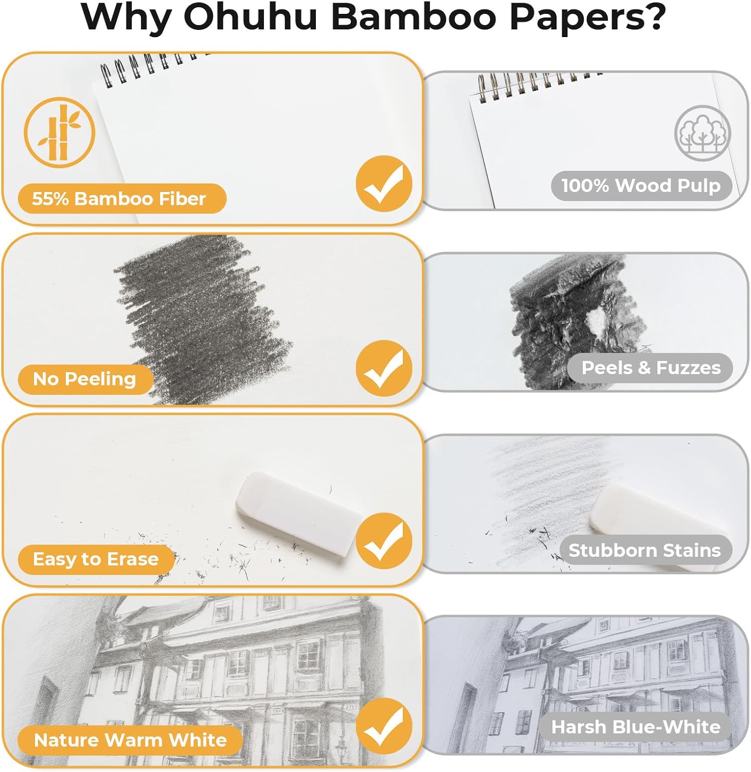 - No Peeling & Durable Erasability - Crafted from 55% bamboo fiber, this paper surpasses wood pulp with its peel-resistant surface and durable erasability. It handles heavy coloring and layering without warping or curling. The abrasion-resistant surface withstands repeated erasing, allowing for unlimited revisions and creative exploration. Perfect for creators looking to freely express their ideas!