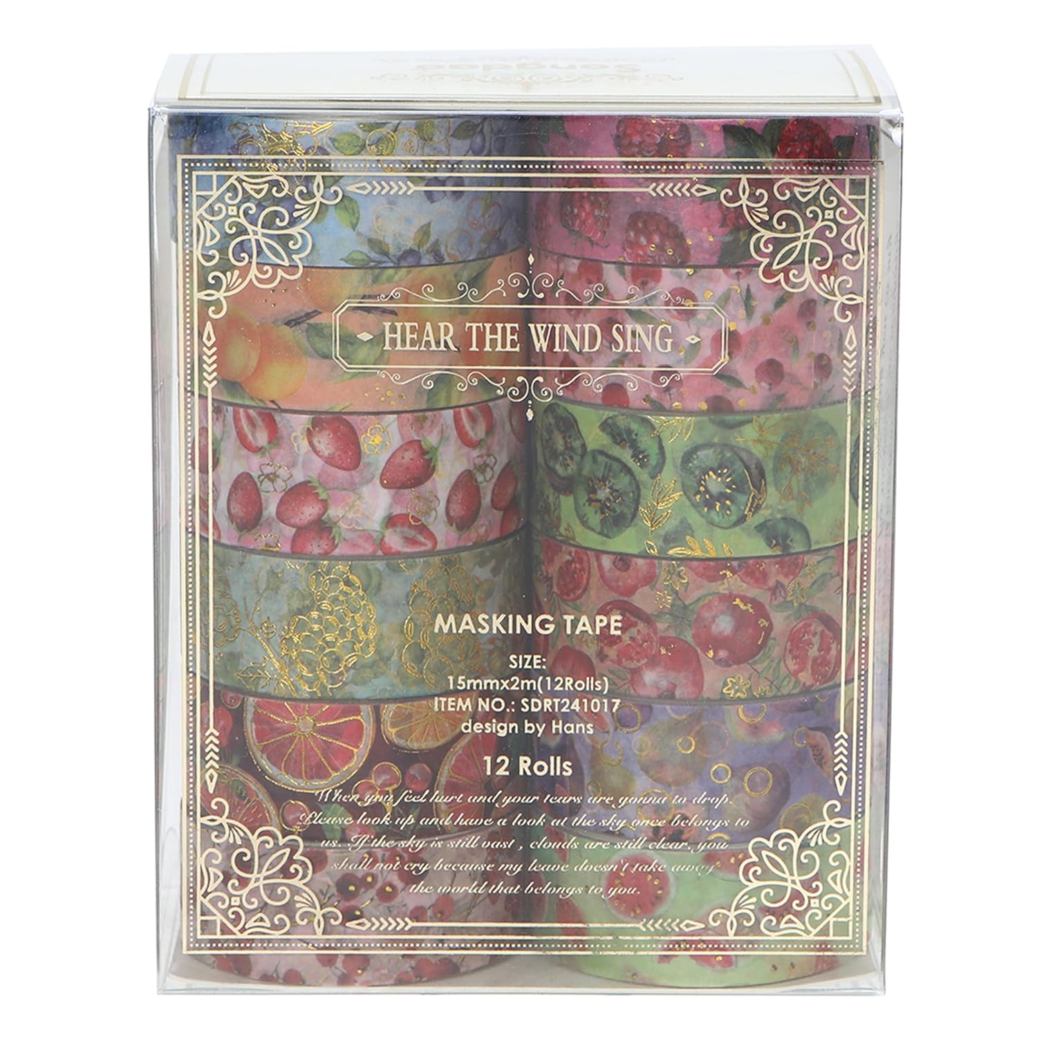 12 Rolls Charming Washi Tape Set Gold Silver Foil Detailing Arts Adhesive Tapes Basic Patterns Decorative Masking Tape Sets for Craft, Kids, Scrapbook, DIY, Gift Wrapping (Fruits Feast)