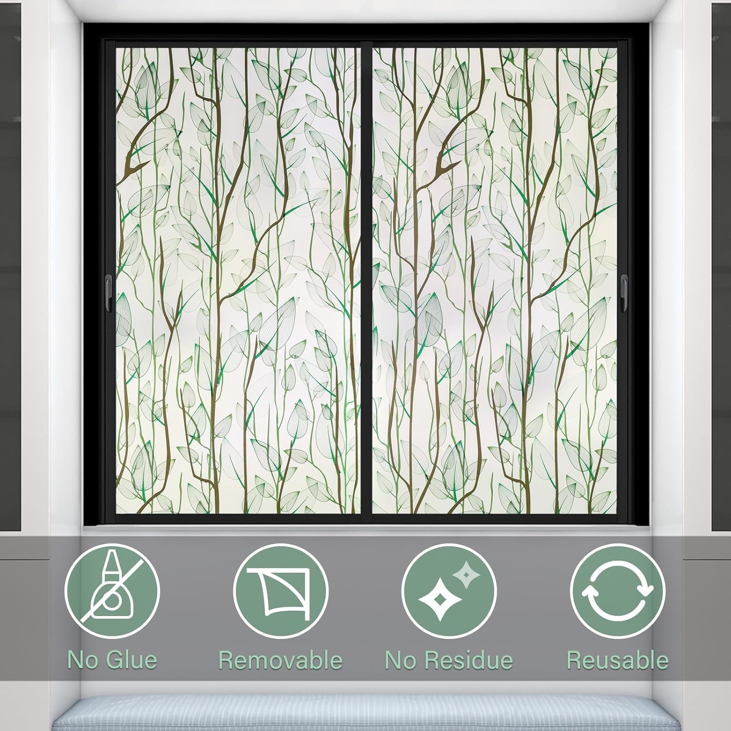 Donox Frosted Glass Window Film Heat Control UV Blocking, Static Cling Reusable Home Bathroom Door Window Privacy Film, Green Leaf Pattern Window Covering with Installation Tool, 23.6 in x 13.1 feet