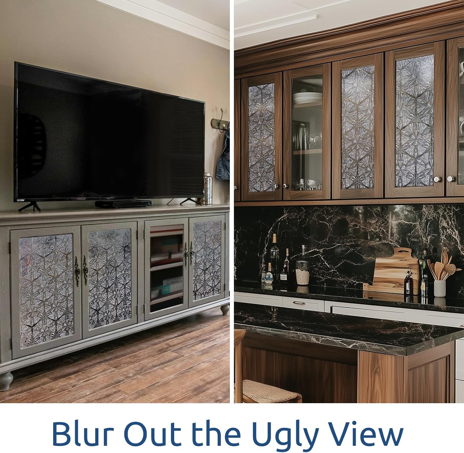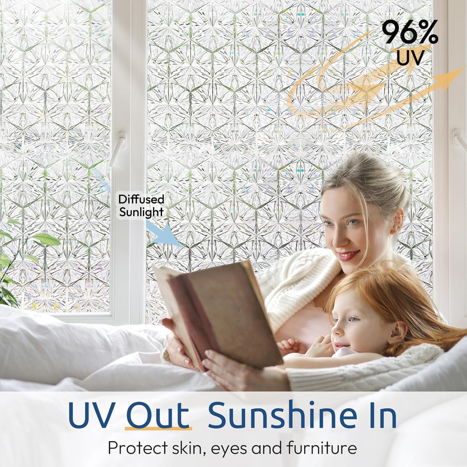 - Prismatic Geometric Brilliance: Featuring symmetrical starburst and snowflake patterns, this decorative window film creates stunning 3D effects under different sunlight angles, adding modern elegance and natural charm to your house