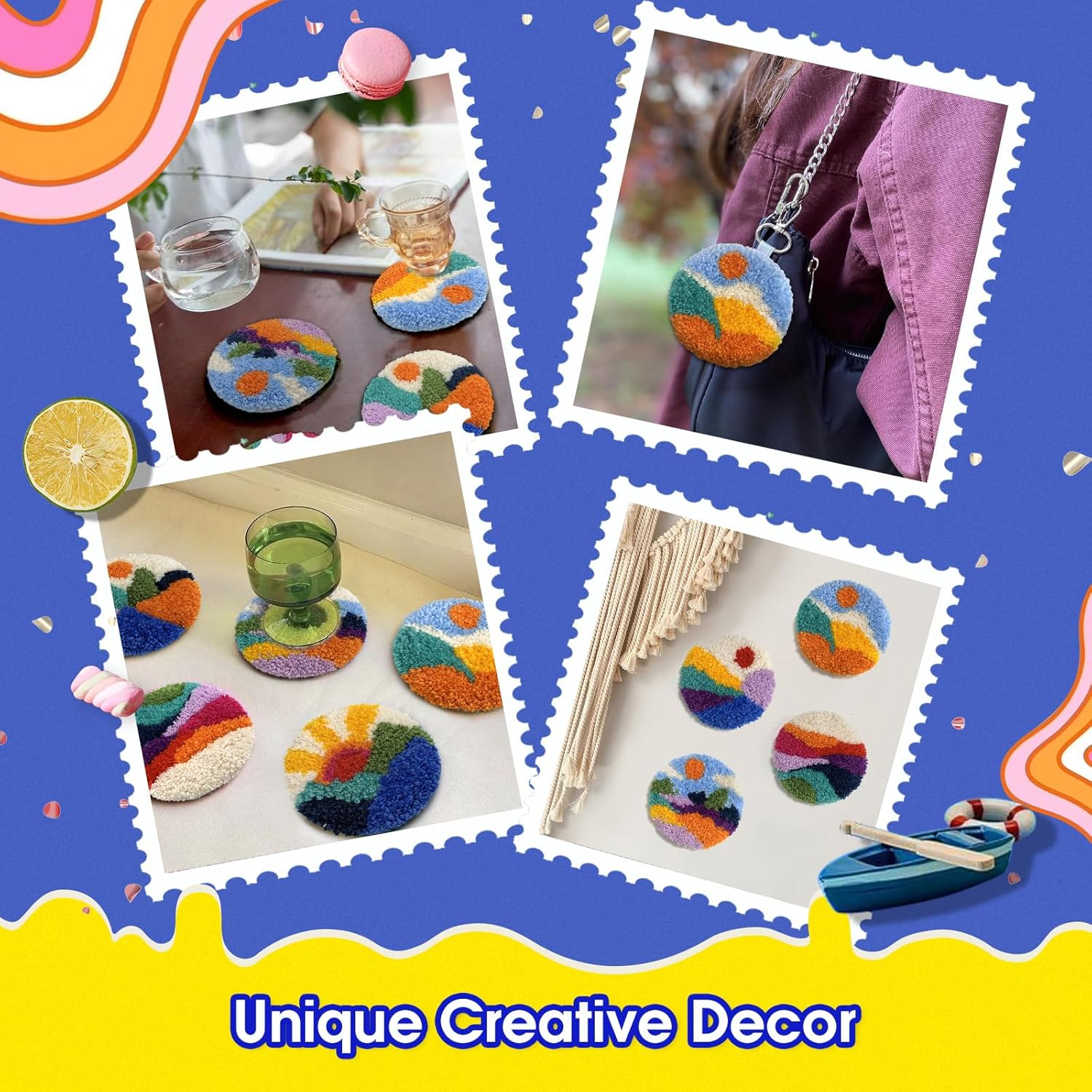 - High-Quality Materials and Abundant Accessories: This punch needle kit is beautifully packaged in a gift unique-designed box. The kit includes: 6 patterned cloths, 1 embroidery hoop, 6 adhesive felt pieces, 1 coaster holder, 6 punch needle tools, and an ample supply of embroidery yarn threads. Everything you need to create beautiful crafts