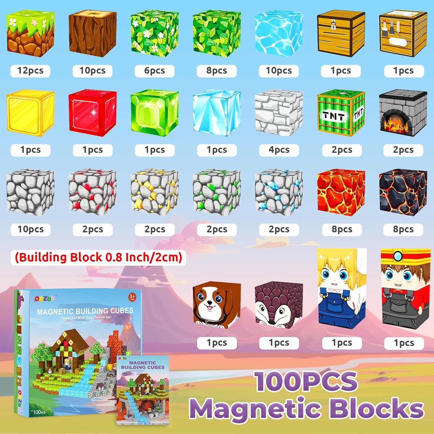 - MAGNETIC BUILDING BLOCKS - The 100-piece (0.8x0.8x0.8IN) magnetic blocks set features dual themes: forest and mine. It contains 25 carefully designed elements, suitable for boys and girls aged 3 and up. Children can use their imagination to freely build their own worlds, enhancing their patience, concentration, and motor skills.