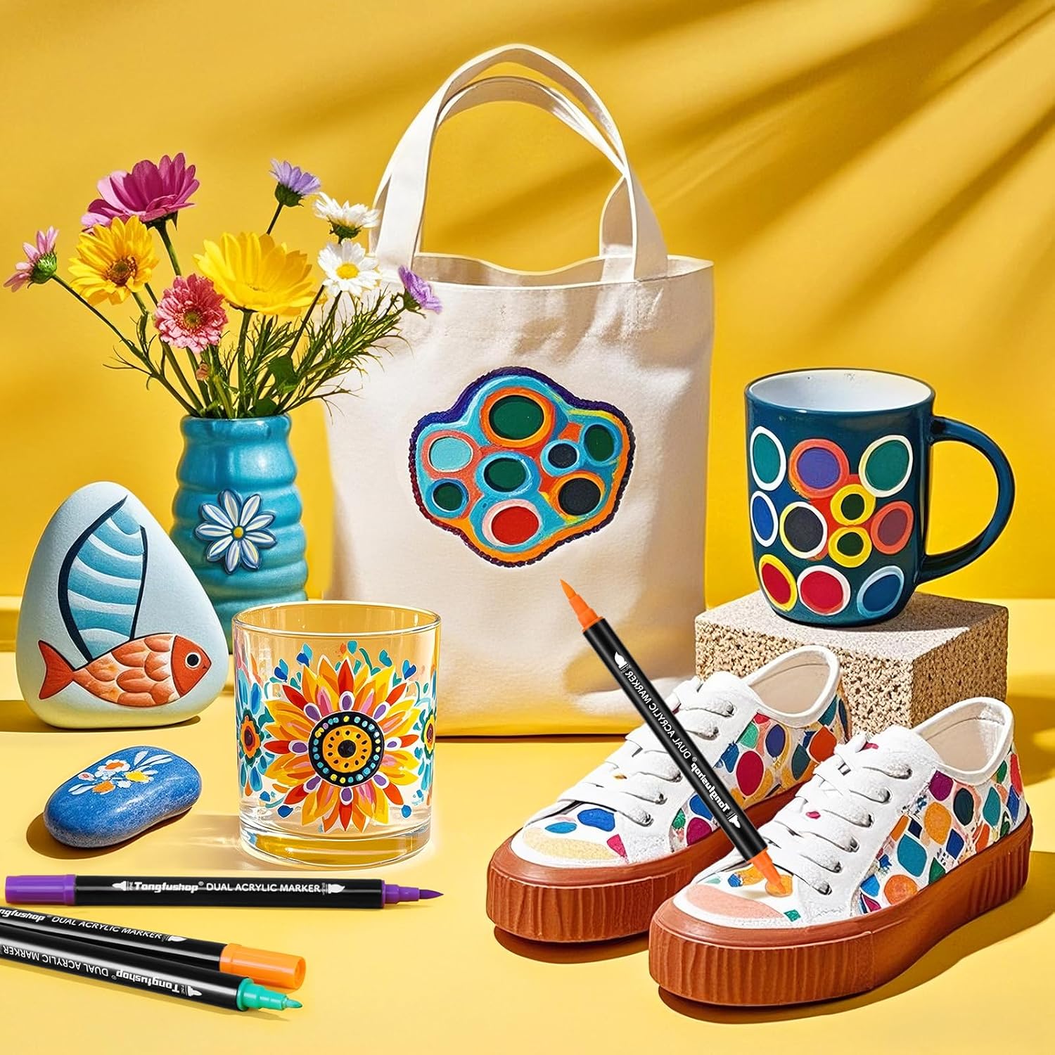 Tongfushop 84 Colors Acrylic Paint Markers, Dual Tip Acrylic Paint Pens with Brush Tip & Fine Tip, Fabric Markers for Rock Painting, Wood, Canvas, Stone, Glass, Ceramic, DIY Crafts, Art Supplies