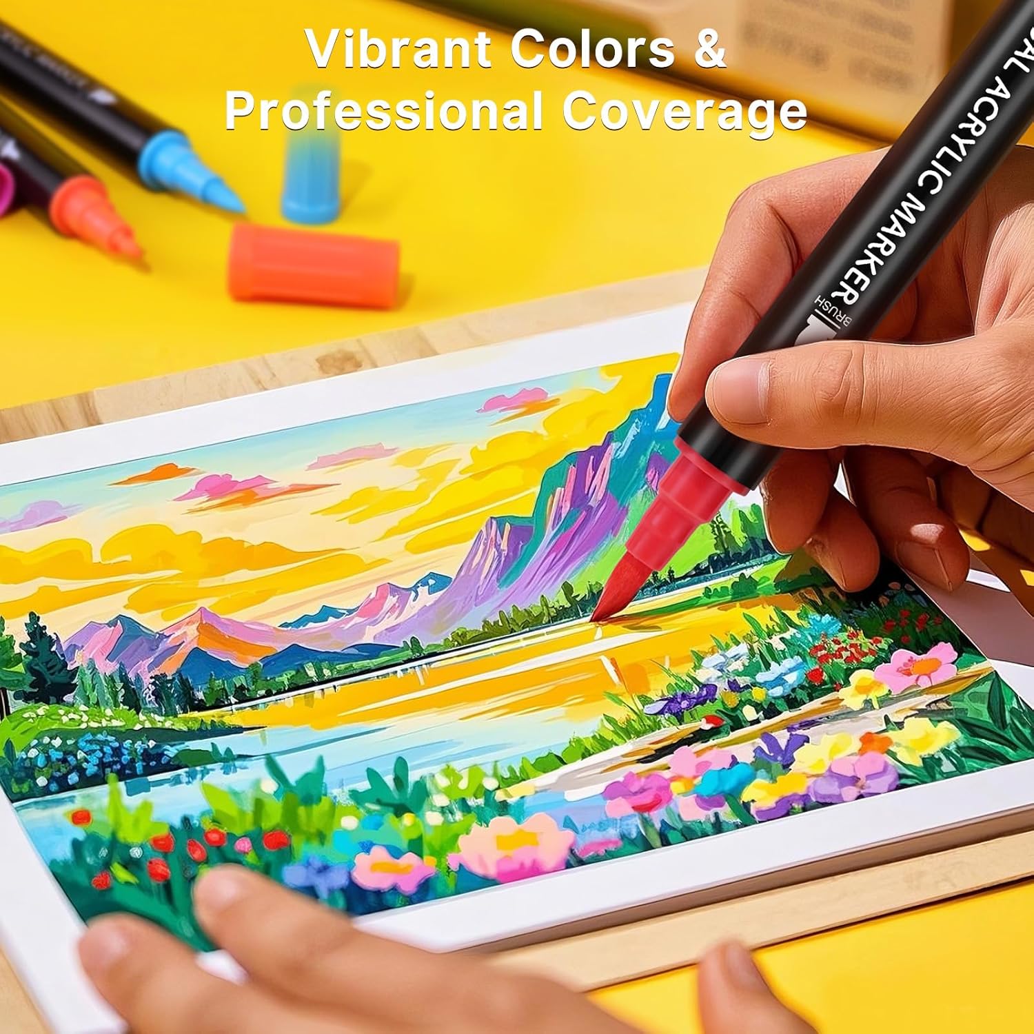 - 🔀【Dual-Tip Precision: Fine Details to Broad Coverage】Experience professional control with our acrylic paint markers! Each paint pen delivers a 1mm fine tip for intricate details plus a flexible brush tip for smooth shading. Works effectively on rocks, canvas, wood, and glass surfaces.