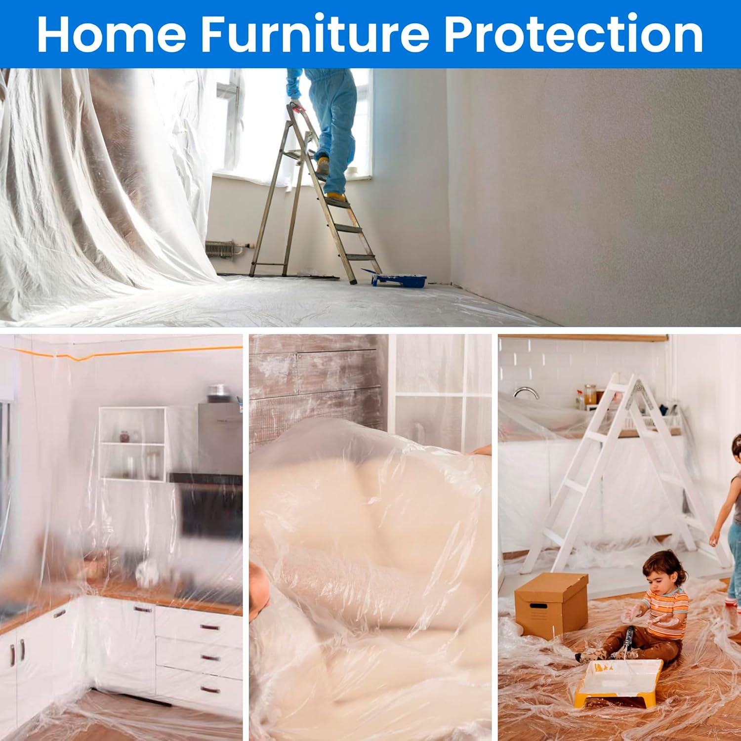 - FURNITURE DUST COVER: Keep your furniture safe and dust-free during renovations or storage with high-quality plastic sheeting and masking tape. Pre-taped covering provides a durable and reliable barrier, ensuring your furniture remains pristine and protected from dust, debris, and scratches. Ideal for both indoor and outdoor use.