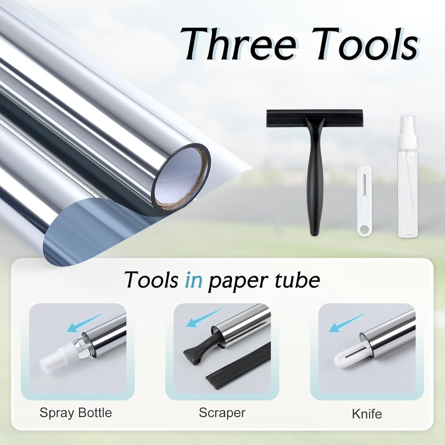 - Free Tools, Do More with Less: The one way window film package includes three free tools: a squeegee, a knife, and a sprayer. It saves money and time while making installation easier. For superior results, thoroughly clean the glass, peel off the backing, and spray plenty of water on both the window and the film