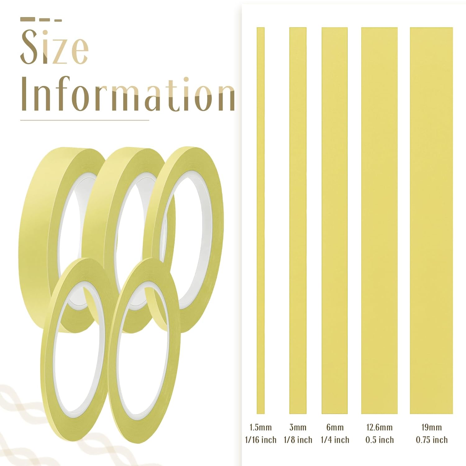 Xuniea 5 Rolls of Vinyl Tape Masking Tape Automotive Car Auto Paint for Curves, High Temperature Vinyl Low Tack (1/16 Inch, 1/8 Inch, 1/4 Inch, 1/2 Inch, 3/4 Inch,Yellow)