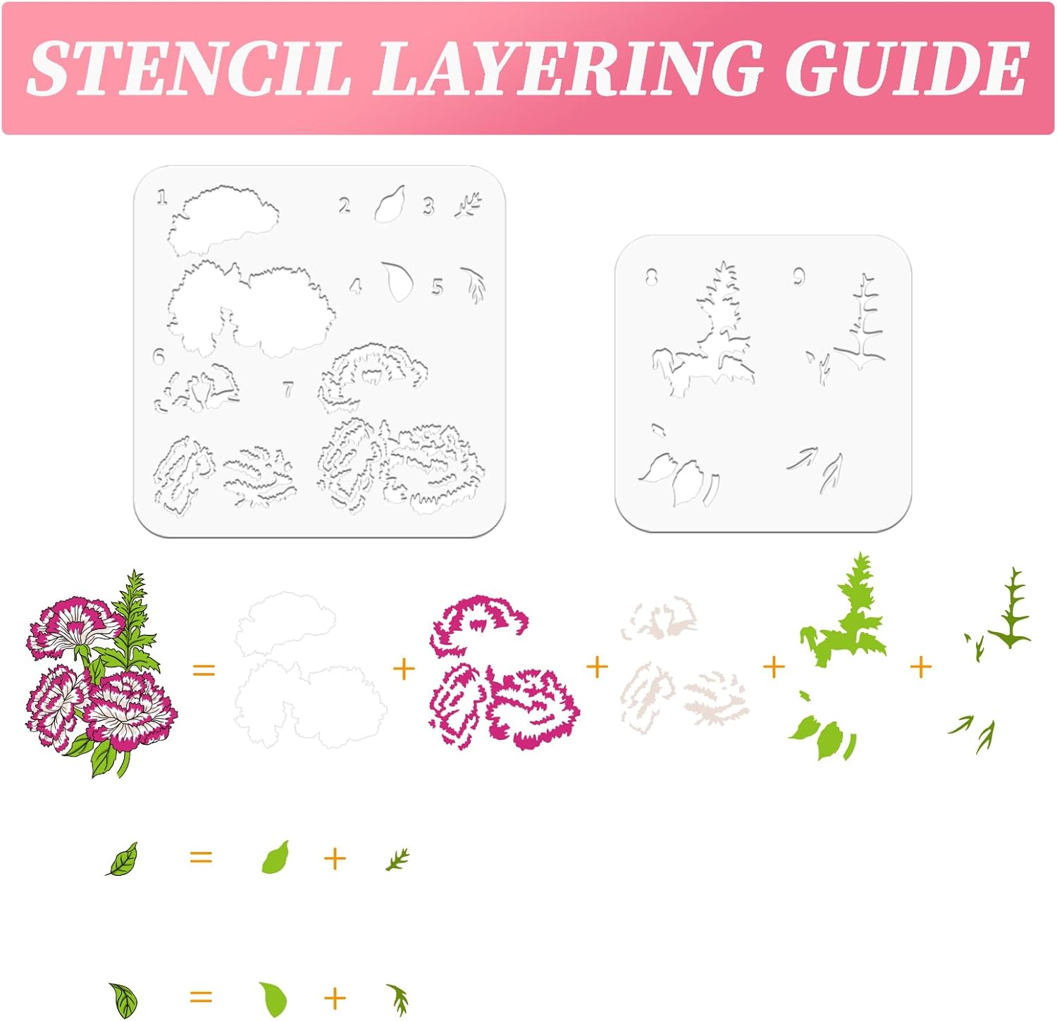 - Package Includes: You will receive 1 sheet clear stamps(6.3x4.33inch) with Dianthus and leaves, 1 set cut dies for cutting flowers and leaves shapes, and 2 pcs PET stencils for creating color layering effects. The whole set can meet your DIY craft needs