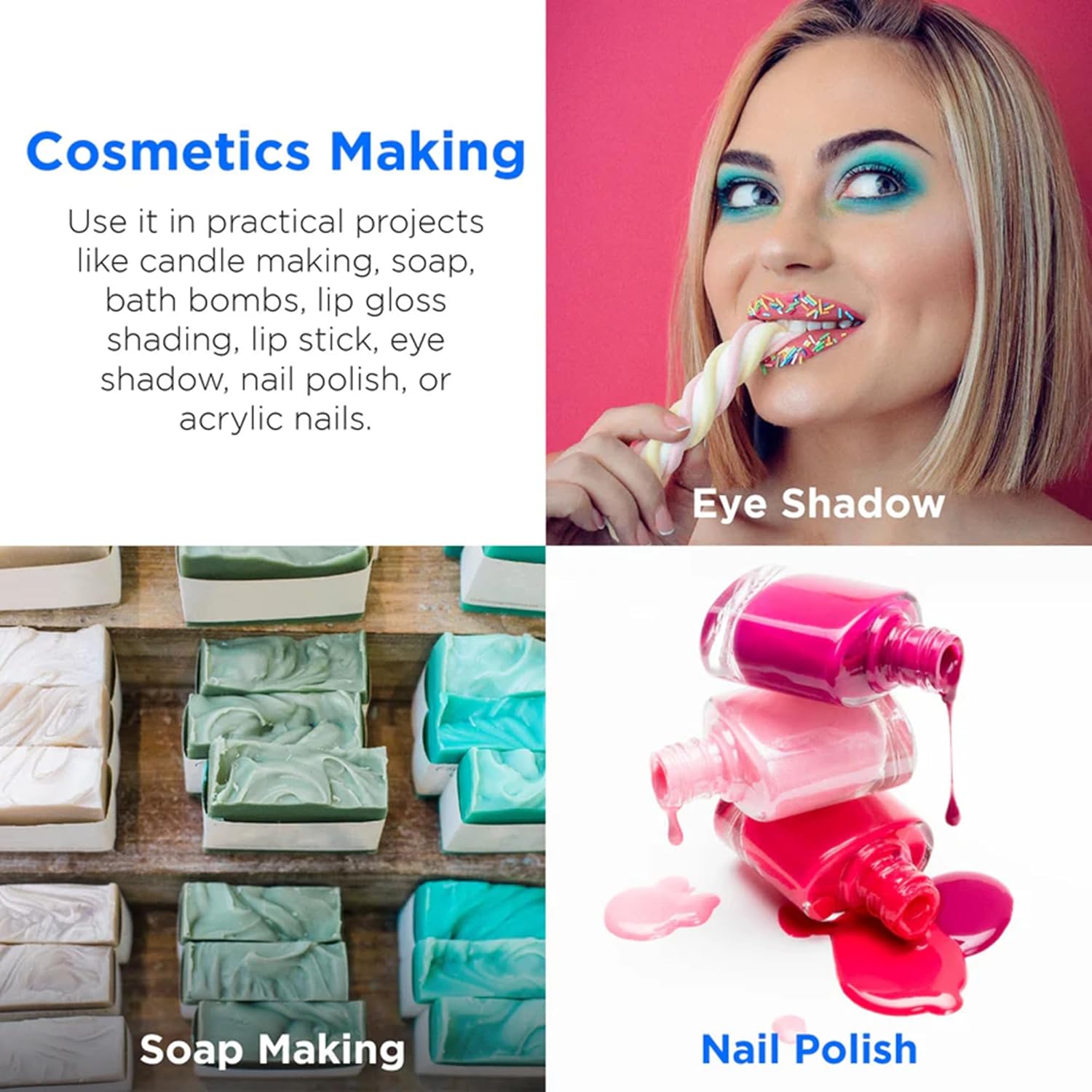 - CRAFTING CREATIVELY - Make your next DIY project pop! Use safe, cosmetic-grade pigments for your art project or scrapbooking. Perfect for epoxy resin, car freshies, hand soaps, candles, acrylic and fiberglass nails, slime, nail polish and even makeup!