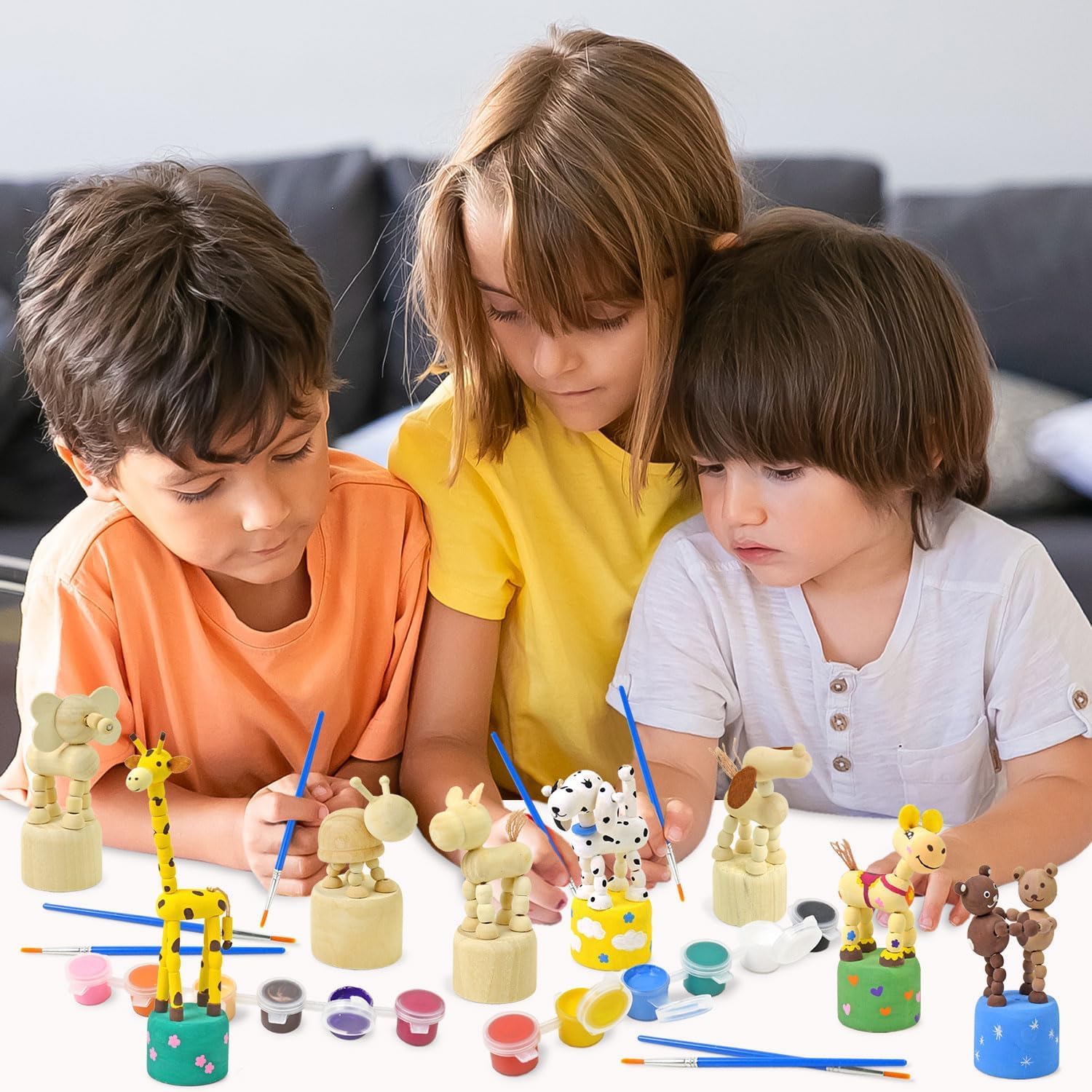 - All-in-One Craft Kit: This wooden kids crafts set includes 8 unfinished animal playset figures, 8 paintbrushes, and 4 strips of 6-color paints (24 paint pots). A perfect art and craft kit designed for kids ages 3-5, 4-6, and 8-12 to enjoy hands-on creative fun at home or in class