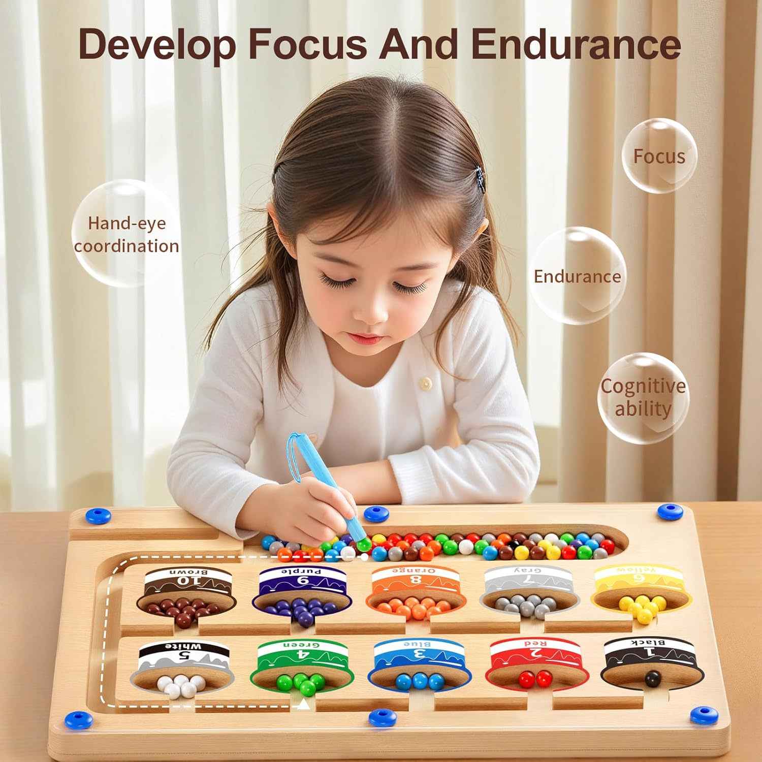 - 【Safe, Durable & Sturdy】: The magnetic maze for kids ages 3-5 is made from natural wood. These sensory toys feature smooth, rounded edges and a strong, durable transparent PET cover—secured with 8 nails. The permanently sealed top prevents beads from falling out, ensuring children’s safety. It also has a built-in wand slot for easy storage, making it a practical learning toy for for 3 4 5 year old toddlers.