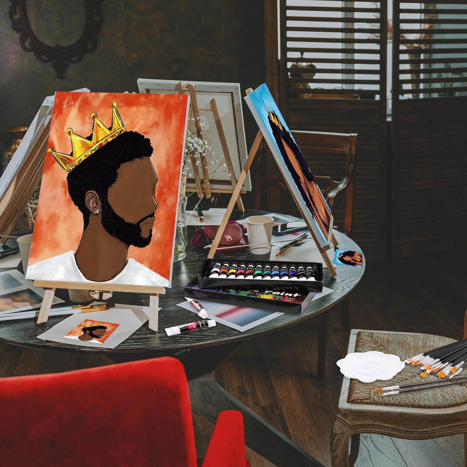 - Extensive Pre Printed Canvases Set: a total of 8 pre printed canvas, with 8 different well designed patterns; Comes with 12 reference color matching cards corresponding to the pattern; 2 packs of acrylic paint set, each pack contain 12 different colors; 2 pcs wooden easel holders; 8 packs of paintbrushes, 3 per pack, including 3 different pen and 8 pcs of white paint trays