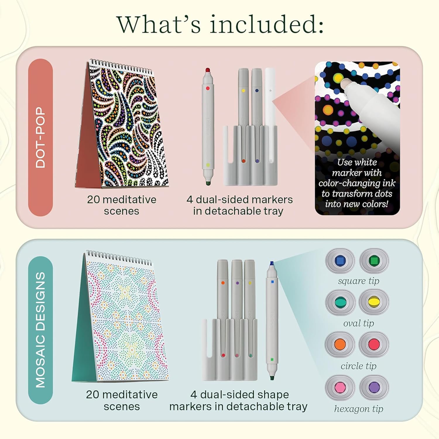 - PATENT PENDING, INNOVATIVE ACTIVITY PADS: Get into a calming flow state. This Lifelines FlowArt 4-Pack includes Dot-By-Letter, Mosaic Designs, UV Art, and Dot-Pop activity pads. Each pad includes 20 meditative scenes and a set of unique markers in a detachable storage tray.