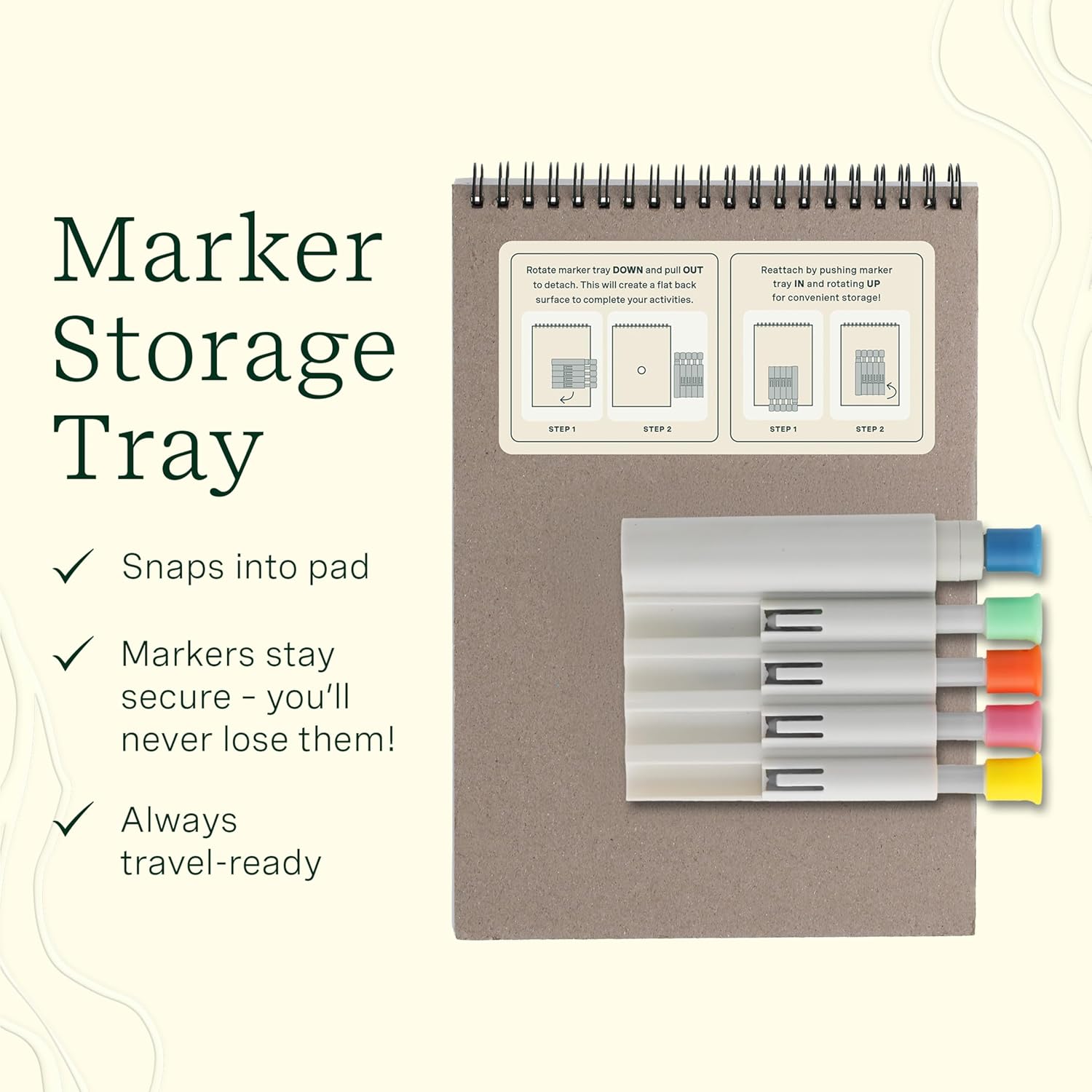 - Detachable Marker Storage Tray: The snap-in storage tray keeps your makers securely attached to the book, so you’ll never lose them, and everything stays together for easy, on-the-go fun!