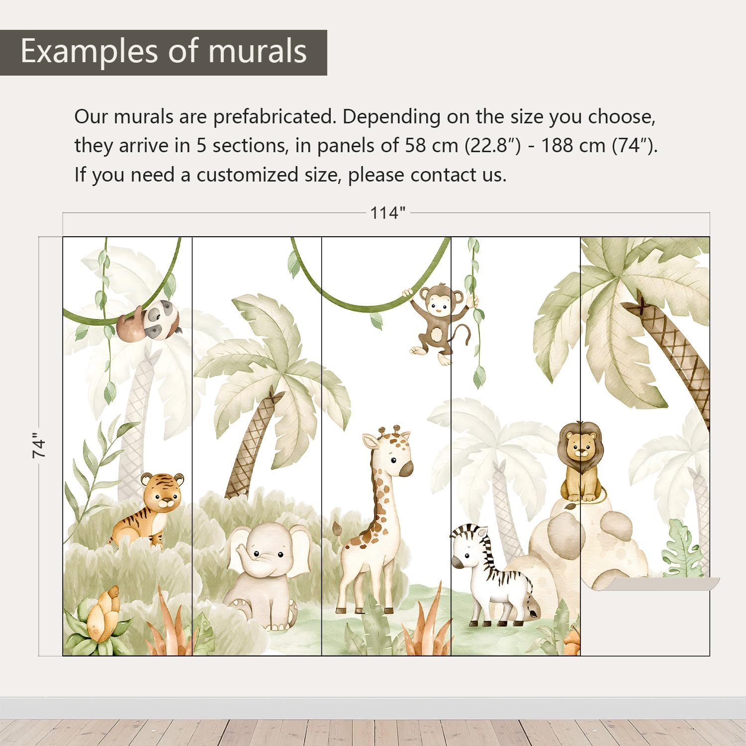 - Size note: Mural measures 114"W x 74"H and is divided into 5 sections, each section is labeled with a number underneath, eliminating the need to overlap patterns when installing.