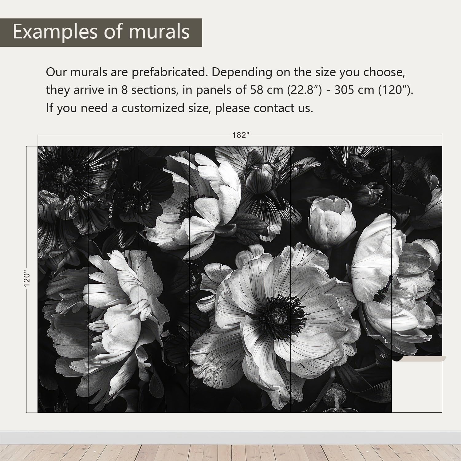 - Size note: Mural measures 182"W x 120"H and is divided into 8 sections, each section is labeled with a number underneath, eliminating the need to overlap patterns when installing.