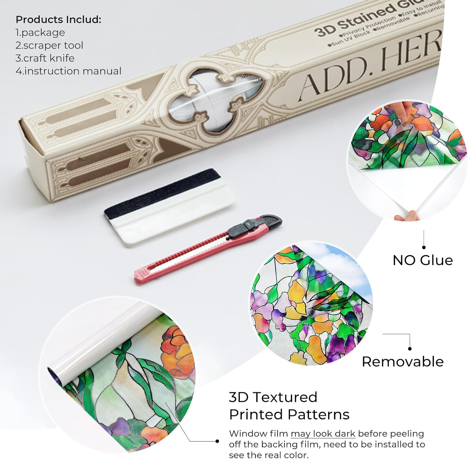 - 【Easy Installation and Adhesive-Free】Our stain glass film installs easily, no glue needed. Just measure, cut, and apply with water on clean glass. It's residue-free for easy repositioning or removal whenever you want a new look.