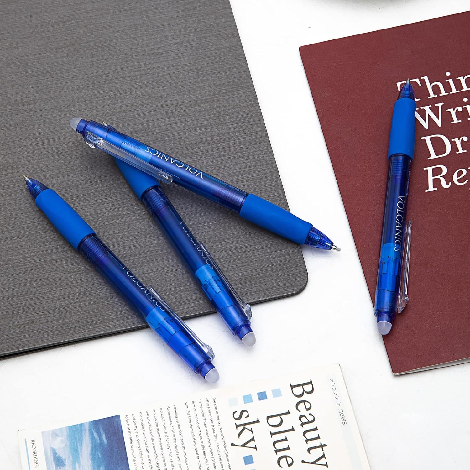 Volcanics Retractable Clicker Erasable Gel Pens - 0.7mm Ball Point, Heat Erase with Built-in Eraser, 36 Pack Blue