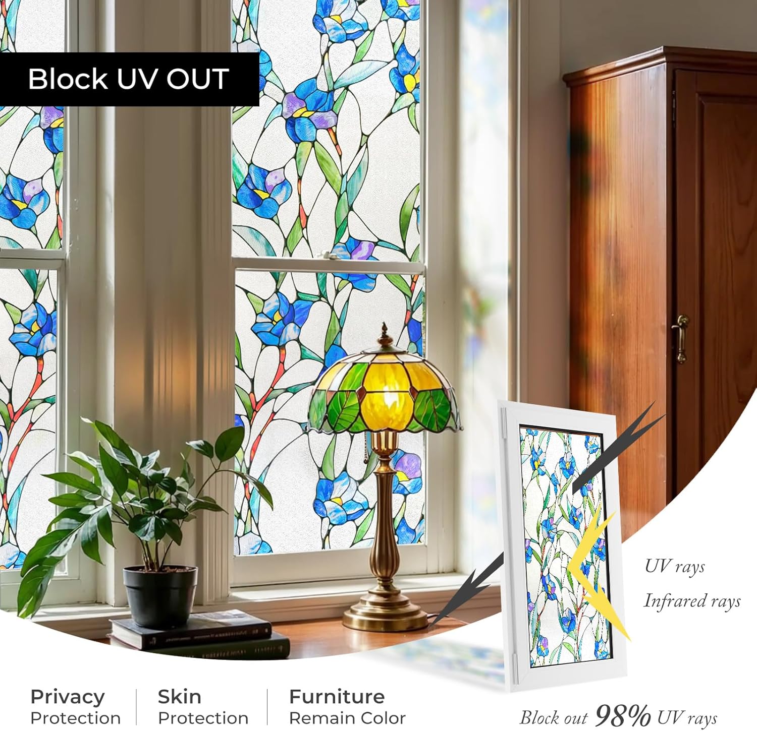 3D Stained Glass Window Film, Decorative Window Privacy Film for Bathroom,Front Door,Home, Sun Blocking Heat Control,Static Cling, Blue Eustoma 23.6inch x 35.4inch