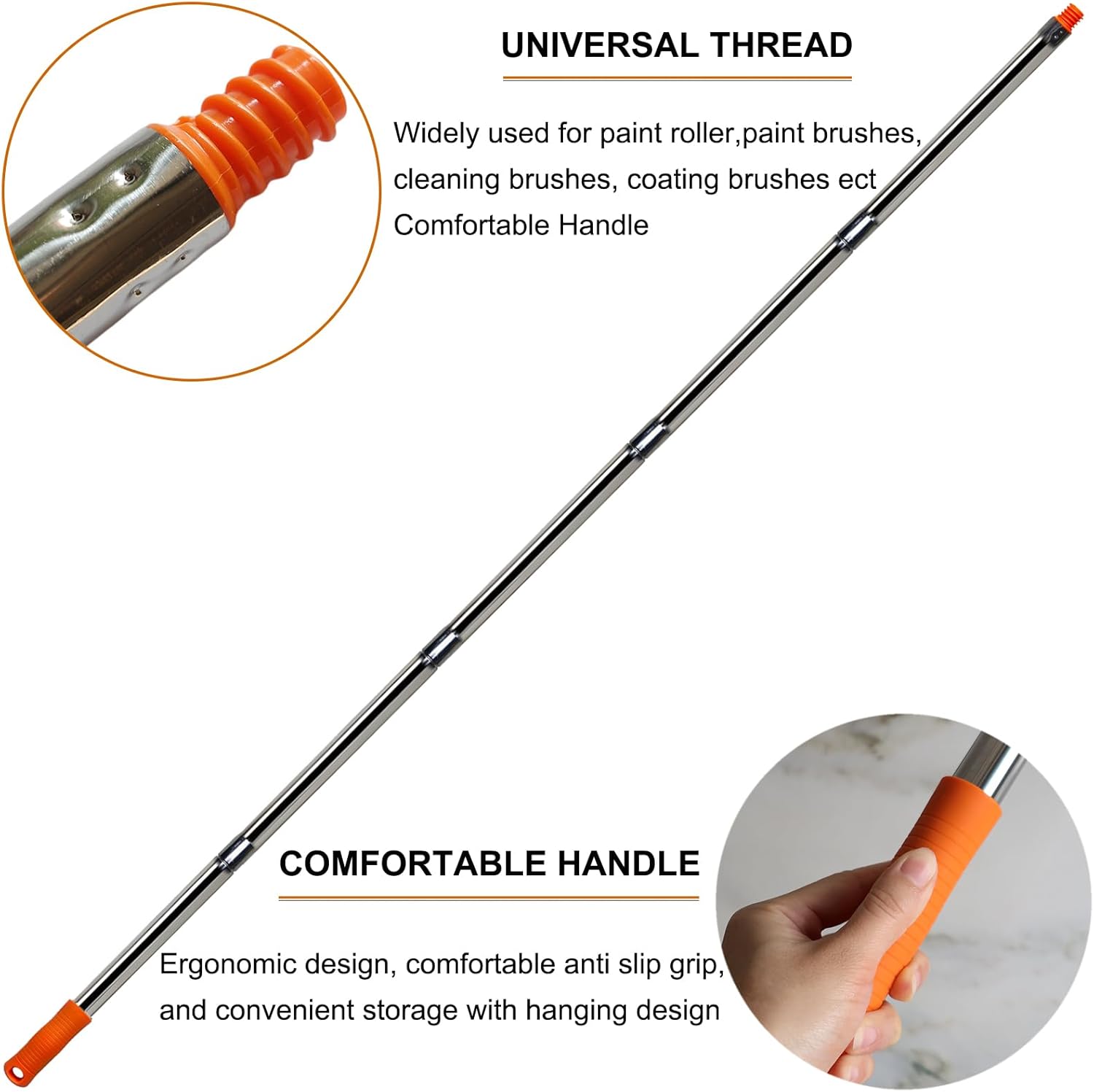- Durable Construction: Our paint roller/Fruit Picker/Duster extension pole includes a 5-piece stainless-steel pole with threaded plastic connectors. The high-quality stainless steel ensures long-lasting use, while the plastic connectors provide a secure and stable connection.