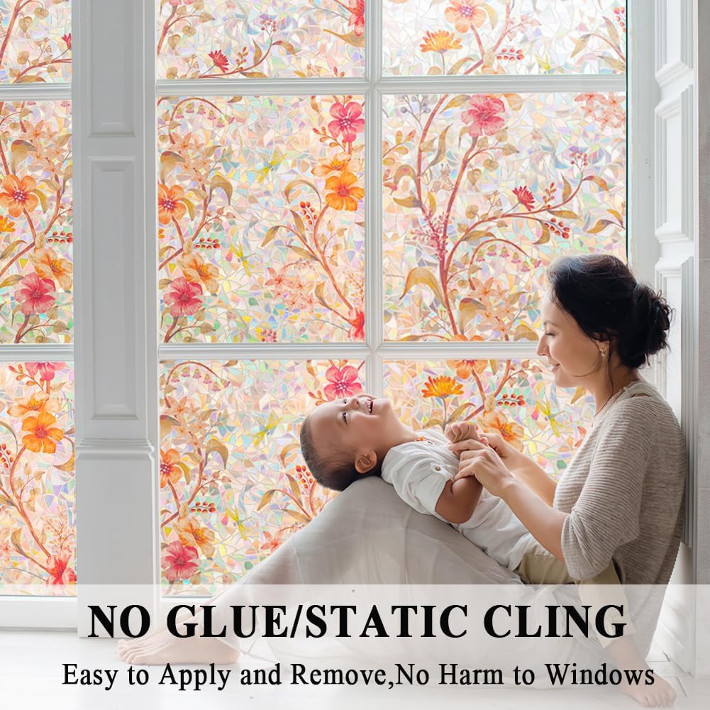 Stained Glass Window Film Static Cling Door Privacy Film Decorative Flowers Red Leaves Window Decals Stickers Heat Control Anti UV for Home and Office,23.6 inches by 78.7 inches