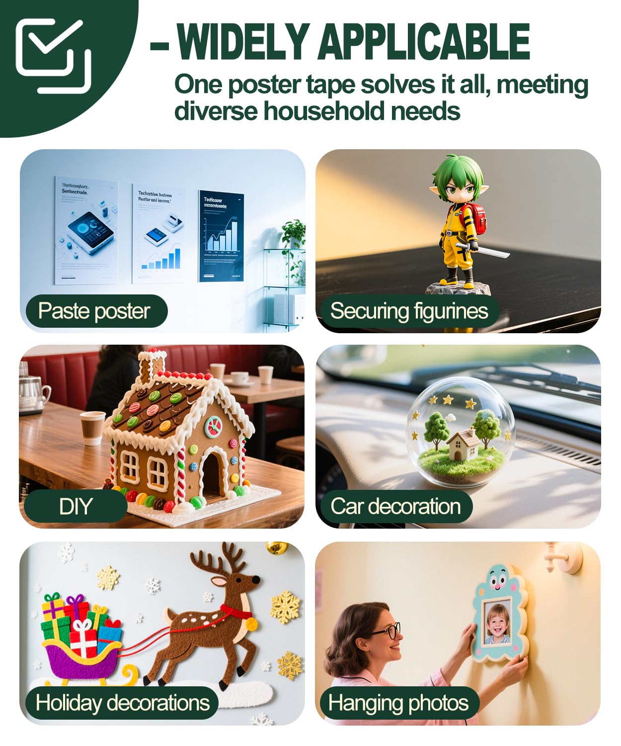 - 【Versatile All-Scenario Use】 Compatible with smooth, clean surfaces like plastic, metal, glass, wood, and ceramic. Perfect for indoor and outdoor applications—home decorations and car accessories such as pasting posters, securing figurines, DIY, car decoration, holiday decorations, and hanging photos. One poster tape solves it all, meeting diverse commercial and household needs.