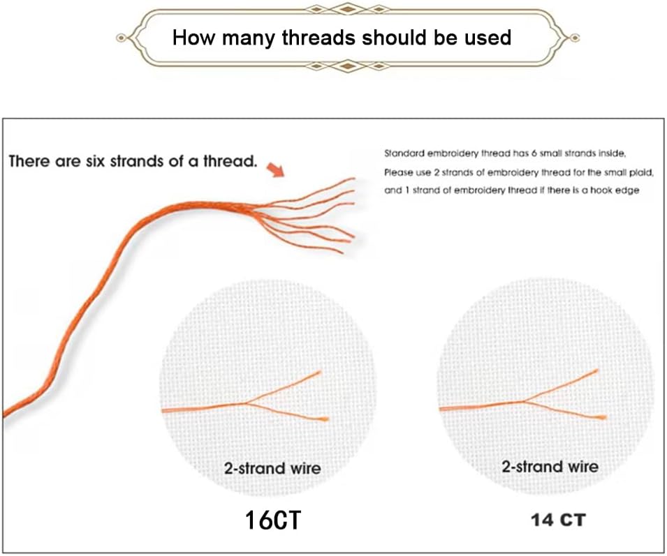 - 【2 strands should be used】16CT type please use 2 strands threads,1 strands threads for back stitch.One thread is composed of 6 strands, so you need to divide the 6 strands into three 2-strand lines before you work.