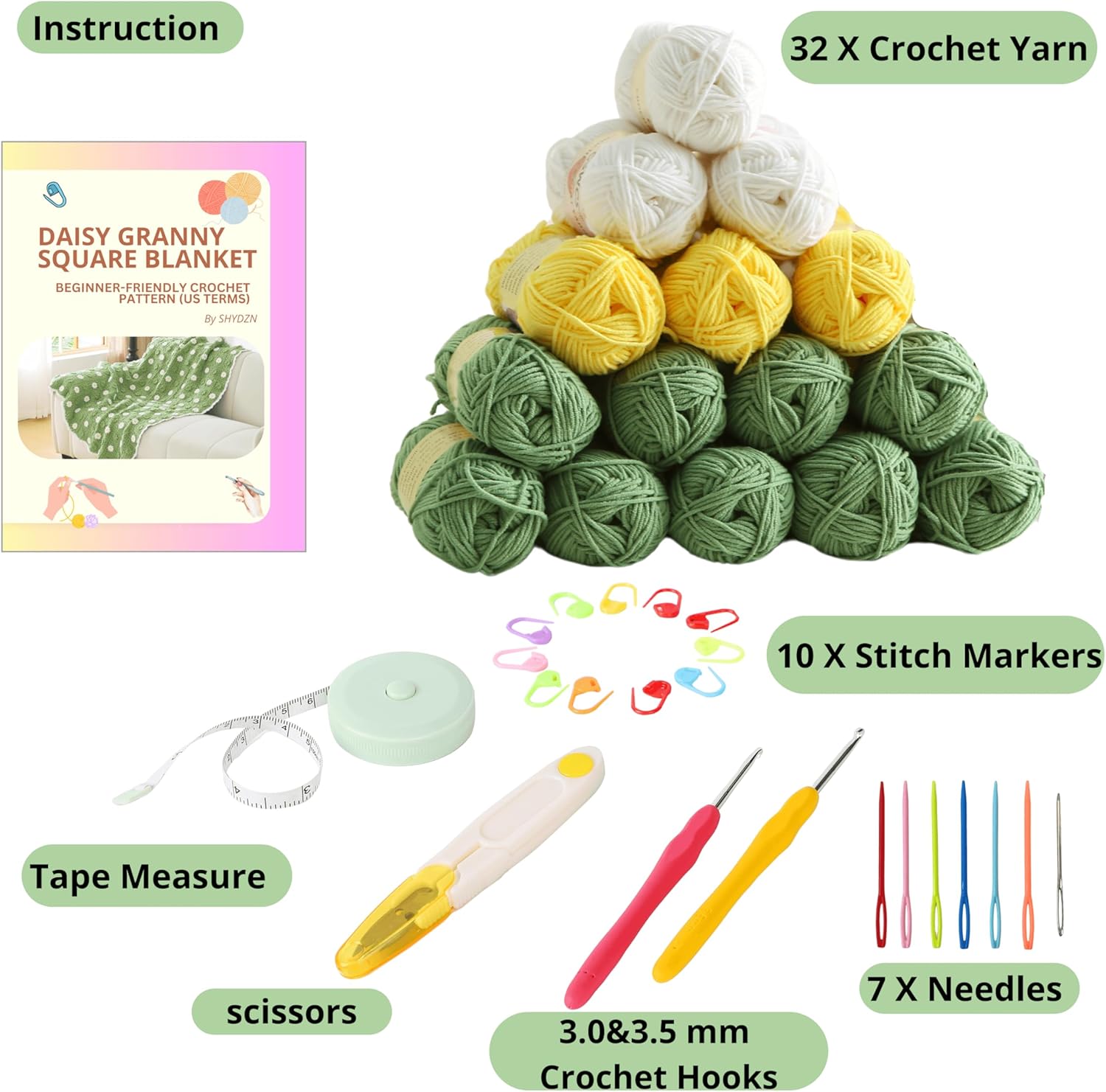 - All-in-One Crochet Kit: Includes 32 rolls Fine/Sport-weight yarn, two crochet hooks (3mm & 3.5mm), 10 stitch markers, 6 plastic yarn needles, and other accessories. No extra supplies required – start crocheting your charming daisy throw right out of the box.