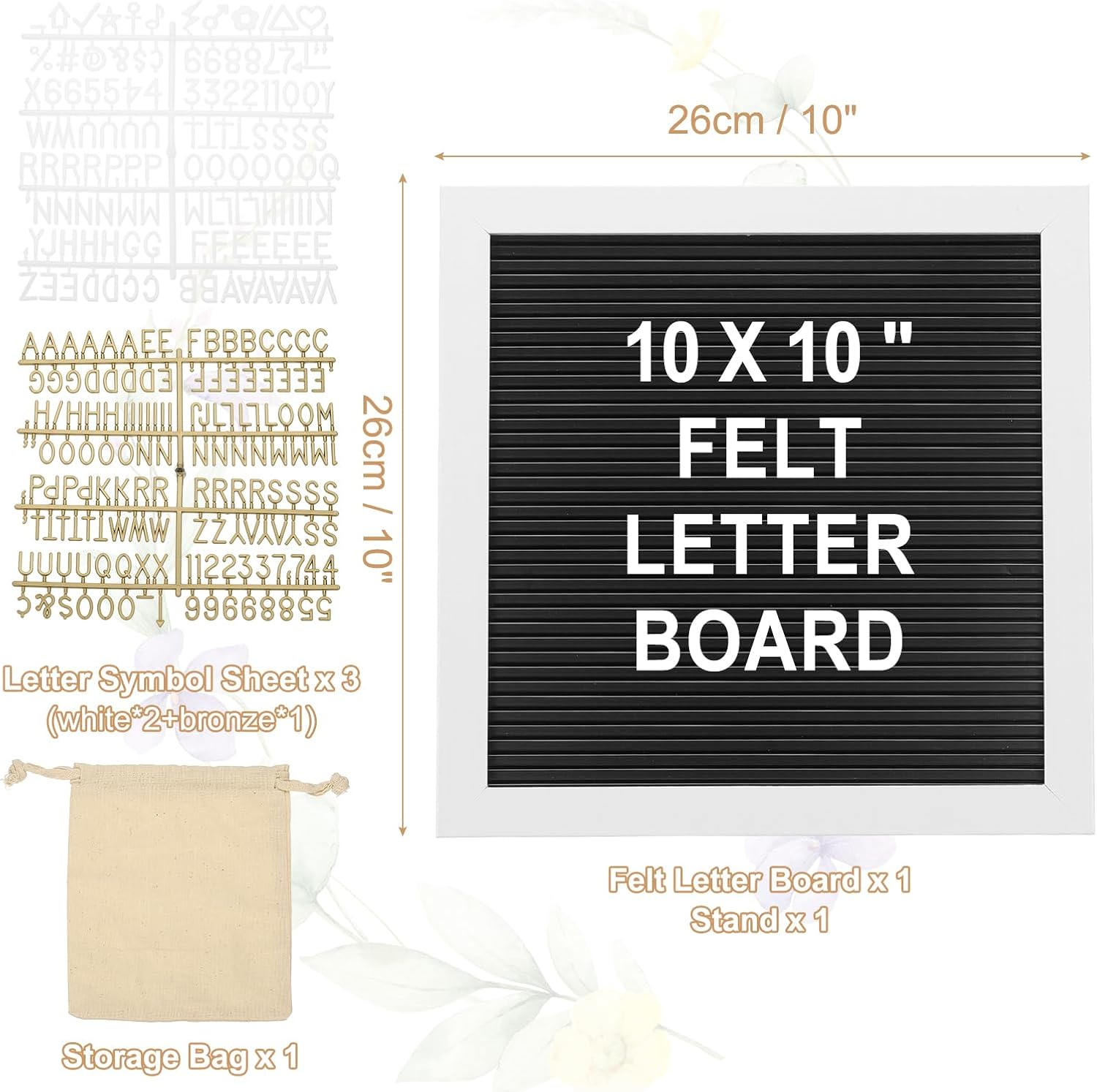 - Material: Felt, Plastic;Board Color: Black White Plastic;Letter Color: White Bronze;Size: 26x26cm / 10x10";Installation Method: Hanging, Stand Supported;Accessories: Storage Bag, Stand;Package Includes: Message Board x 1, Letter Set x 3, Storage Bag x 1, Stand x 1