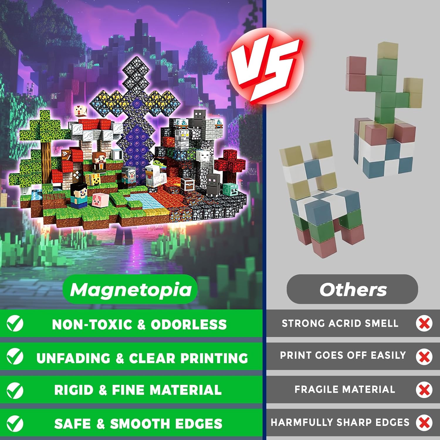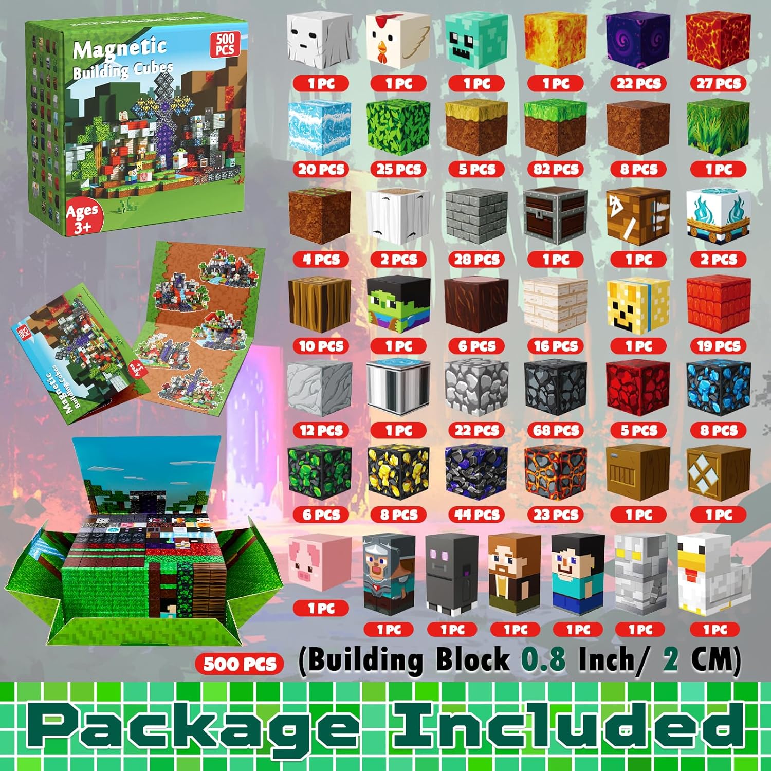 - 【Comprehensive Magnetic Cube Set】Our magnet block set includes 500 cubes in 43 vibrant building designs, accompanied by an idea instruction with engaging story-lines and patterns to keep children entertained. Crafted from high-quality ABS material with smoothly rounded edges, these magnetic cubes are designed for easy handling and safe play, making them perfect for toddlers aged 3+.