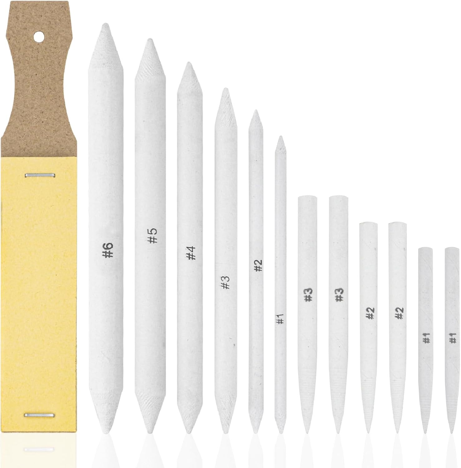 - Complete Set of 13 Pieces: This set includes 6 tortillons (sizes #1 to #3, with two pieces of each), 6 tortillons blending stumps (sizes #1 to #6), and 1 sandpaper pencil pointer. The variety of sizes in these tortillions blending sticks allows you to blend different areas, from fine details to broader strokes, creating unique effects in your artwork. The comprehensive set makes it easy to use the right tortillons for any blending task.