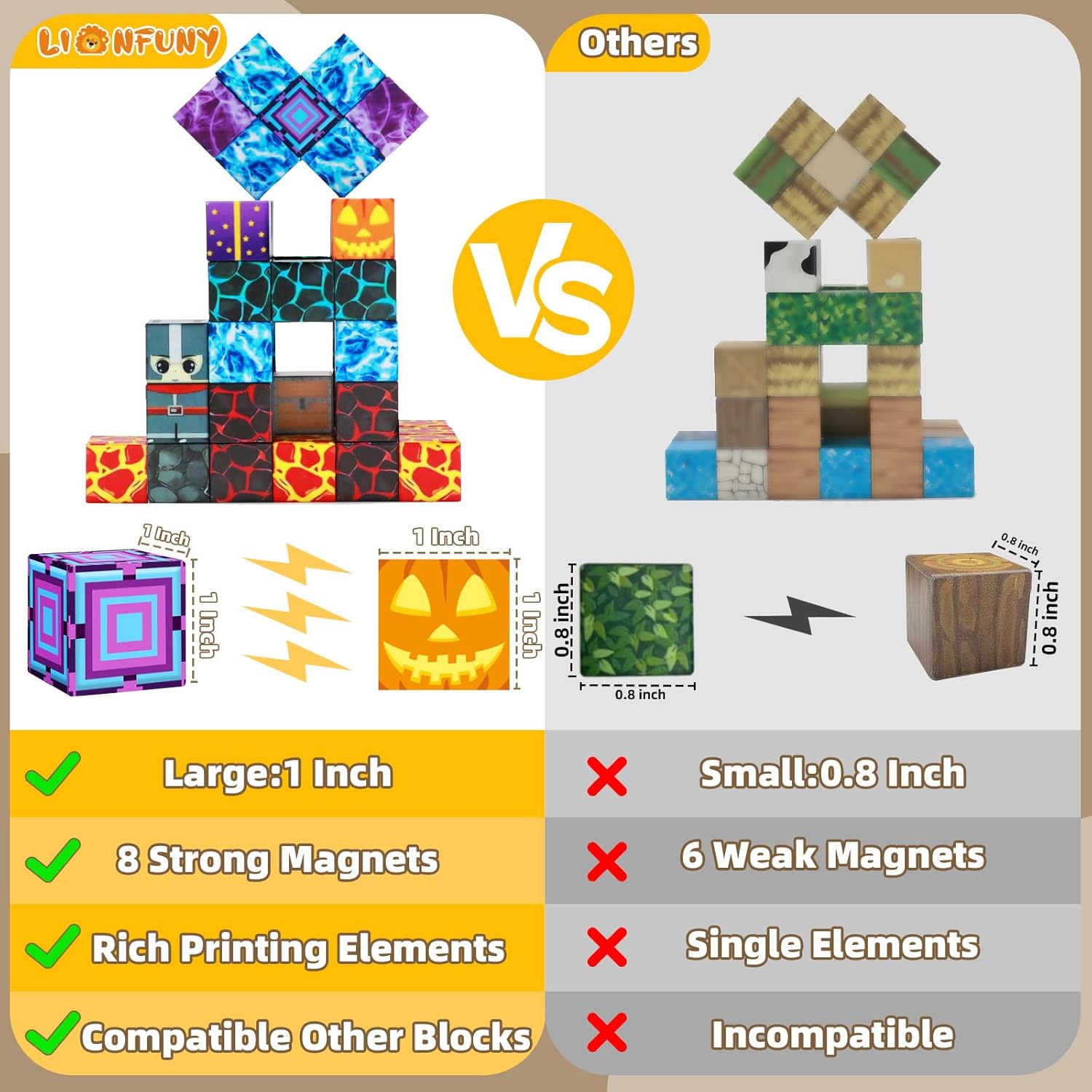 - Upgraded Design: Our magnetic building blocks feature a 1-inch large-size design, significantly bigger than the common 0.8-inch blocks on the market, making them easier for kids to grip and assemble! Each block contains 8 powerful magnets, delivering stronger attraction for enhanced stability—perfect for building tall towers, bridges, and complex structures without toppling. Let your child enjoy endless creative fun!