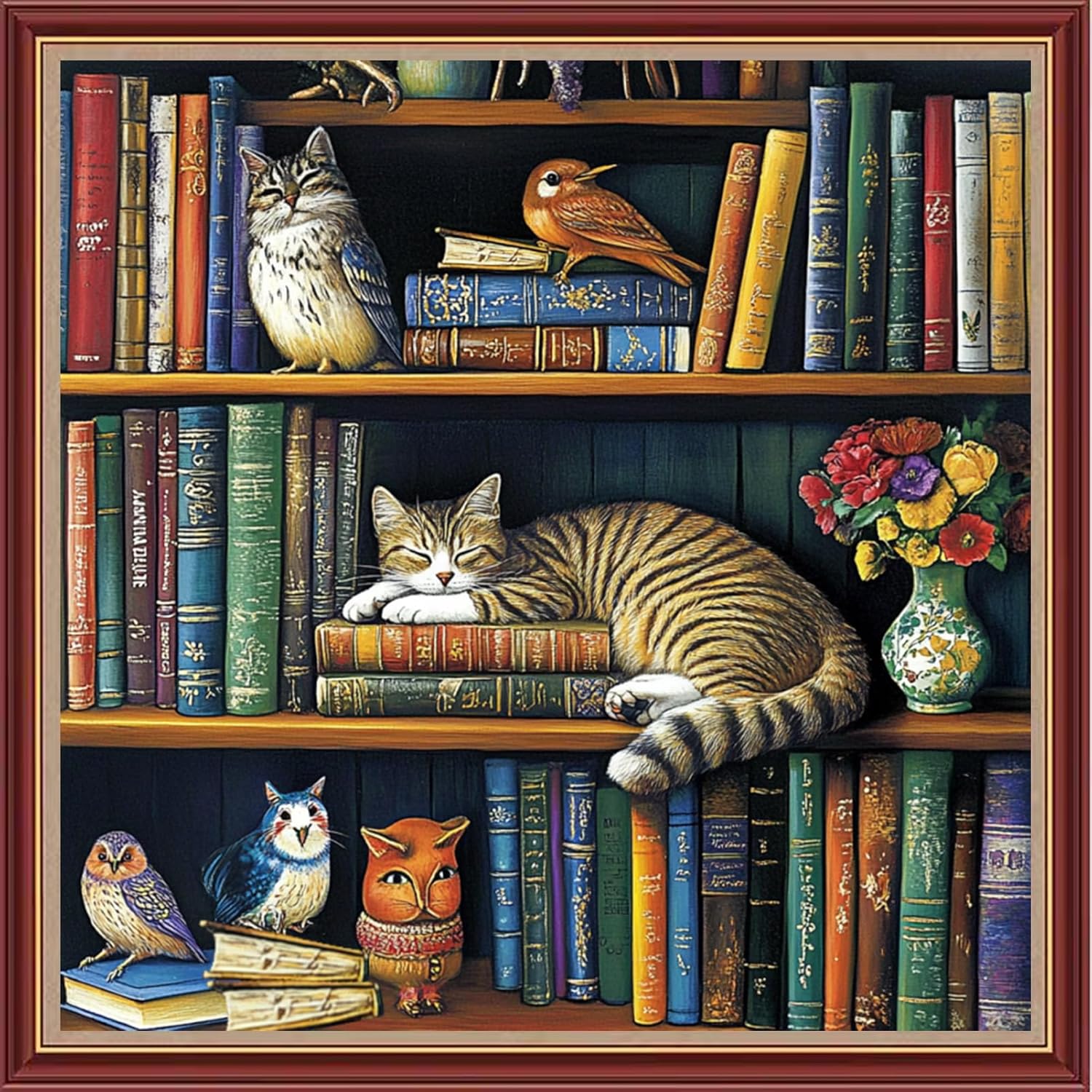 DMCXART Counted Cross Stitch Kits for Adults Needlepoint Kits Unprinted Cross Stitching Embroidery Kit 11CT Cross Stitch Supplies-Bookshelf Cat 18x18 inch