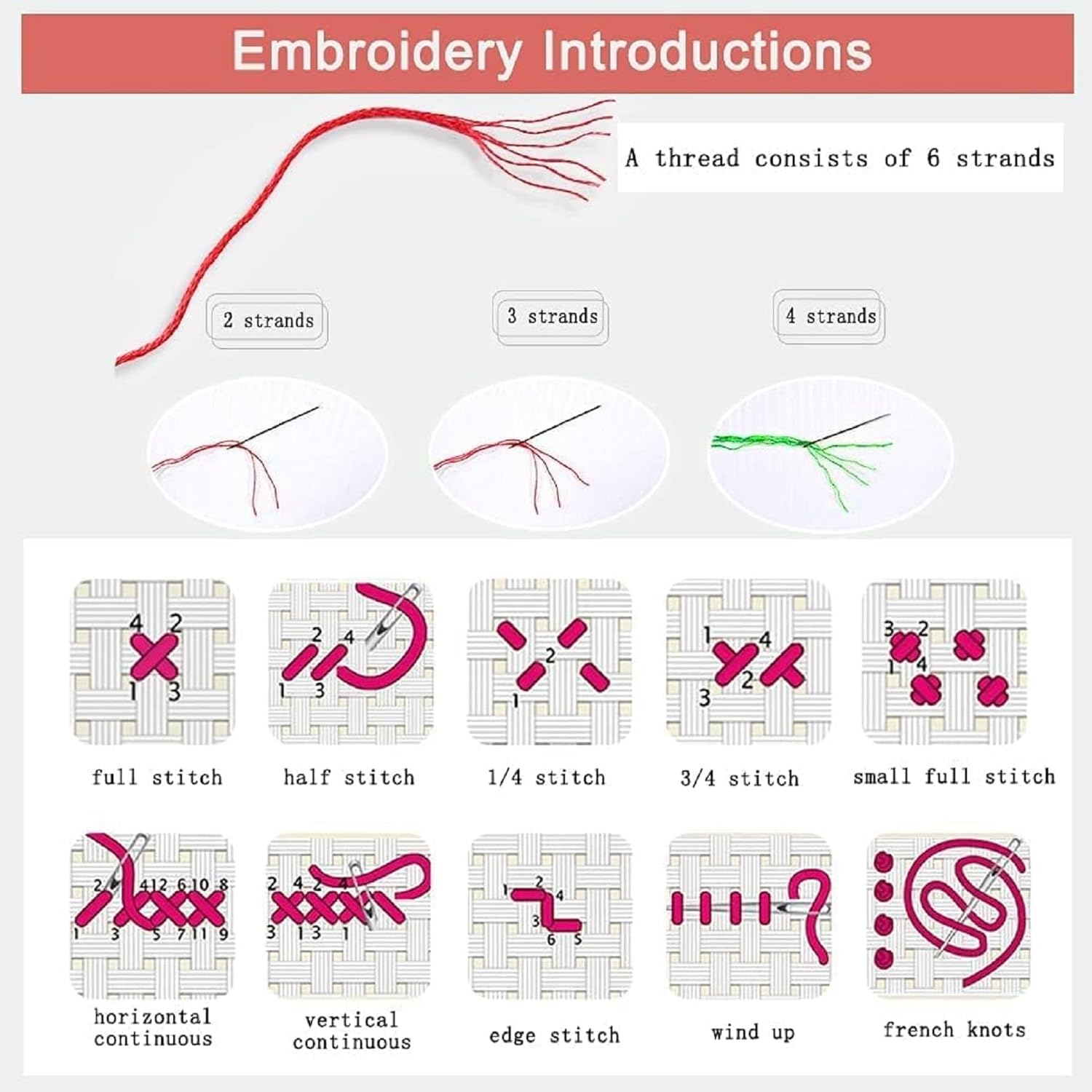 - ✜Fabric size: 11 CT, 18x18 inches. Do not print fabric. The packaging contains 1 embroidery fabric, 2 needles, full-color thread, 1 English instruction, 1 high-definition drawing, 1x scissors, 1x threading device, and 1x top needle. We have provided 30% more threads.
