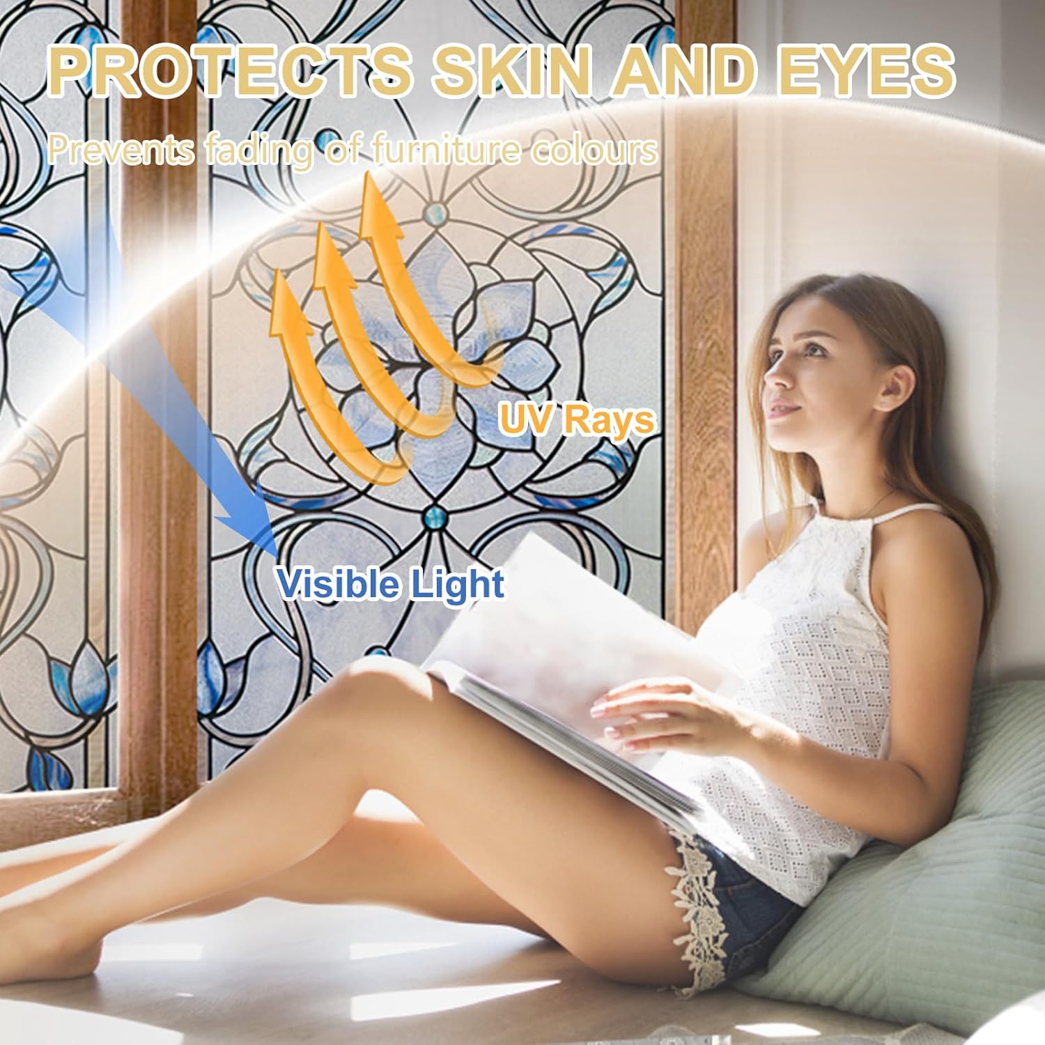 - Effective UV Blocking and Heat Control-This decorative stained glass window film effectively blocks UV rays while still allowing natural light to pass through. Dynamic colour changes under changing light conditions create a stunning effect that enhances enhancing the atmosphere indoors.