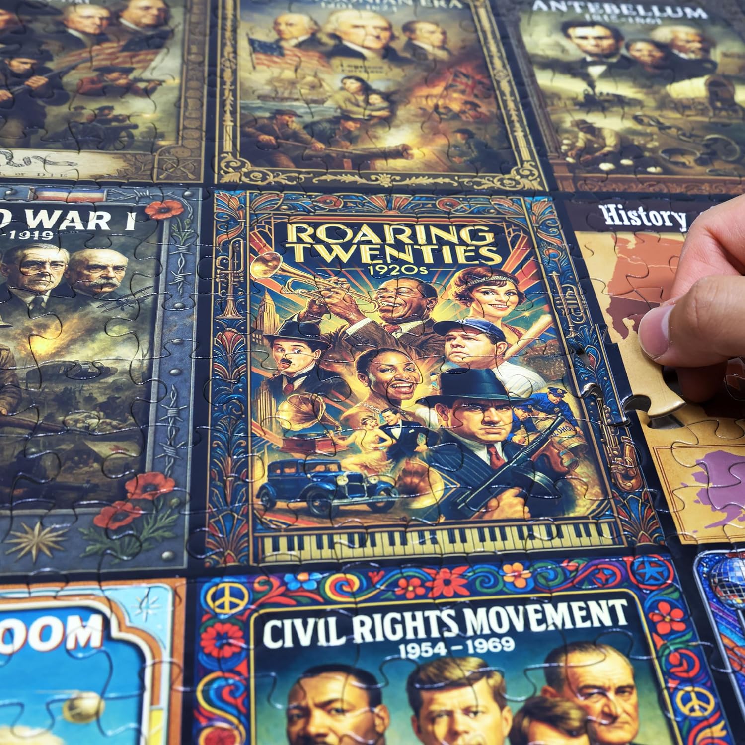 - 【A JOURNEY THROUGH AMERICAN HISTORY】 - Piece together the story of the United States, from the Revolutionary War to the 21st Century! This captivating vibrant colorful puzzle provides a visual timeline of America's most pivotal moments and influential figures. Collection of Stunning Posters of Historic Eras of America including: Revolutionary War, Jeffersonian, Antebellum, Civil War, Gilded Age, Progressive Era, Word War I, Roaring Twenties, The Great Depression, World War II, Post War Boom, Civil Rights Movement, Late Cold War, Post Cold War, 21st Century and more.
