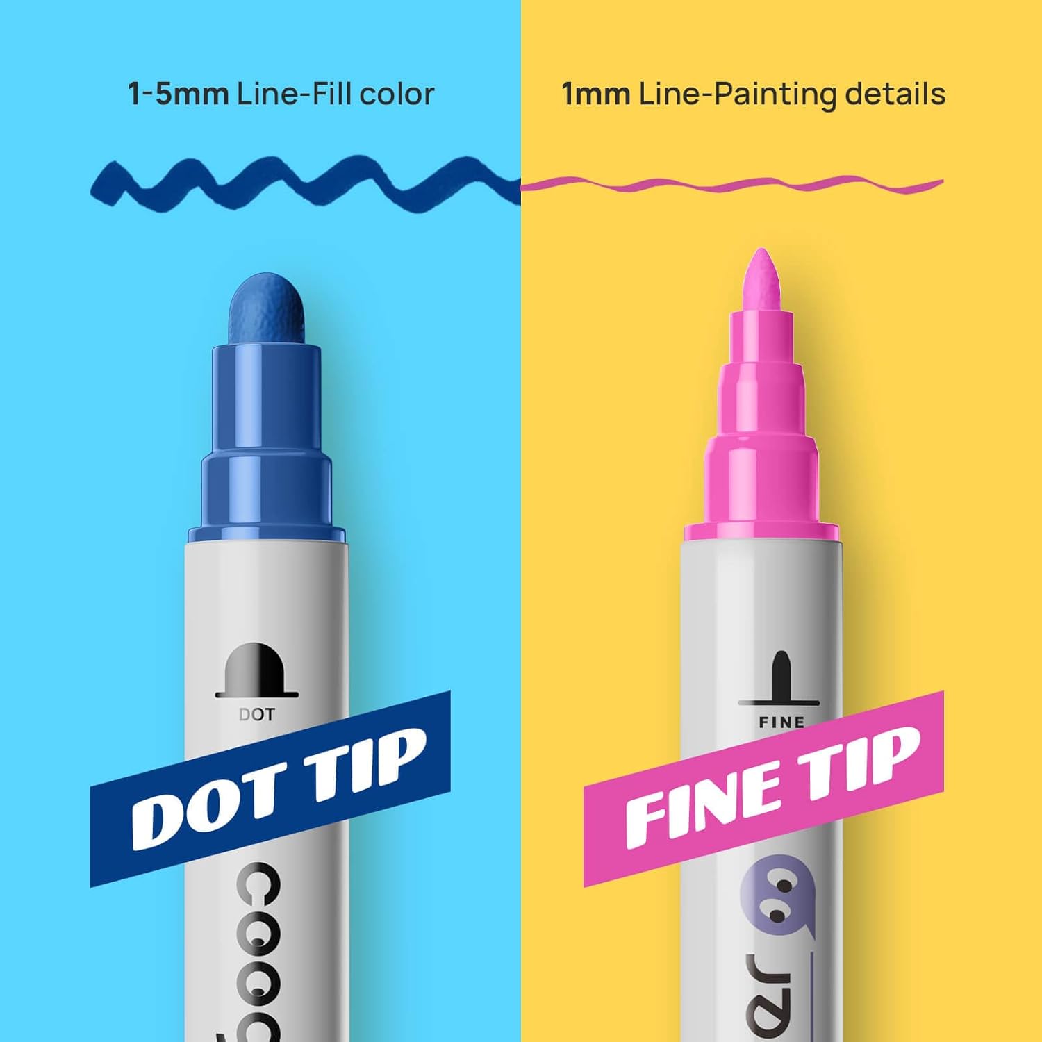 - 【Dual Tip Acrylic Paint Markers】Paint pens acrylic markers include 1-5mm Dot tip and 1mm fine tip. the acrylic brush markers works well for painting, drawing, calligraphy, lettering and sketching., suitable for filling colors and outlining. The fine tip paint pens is suitable for detailed work.