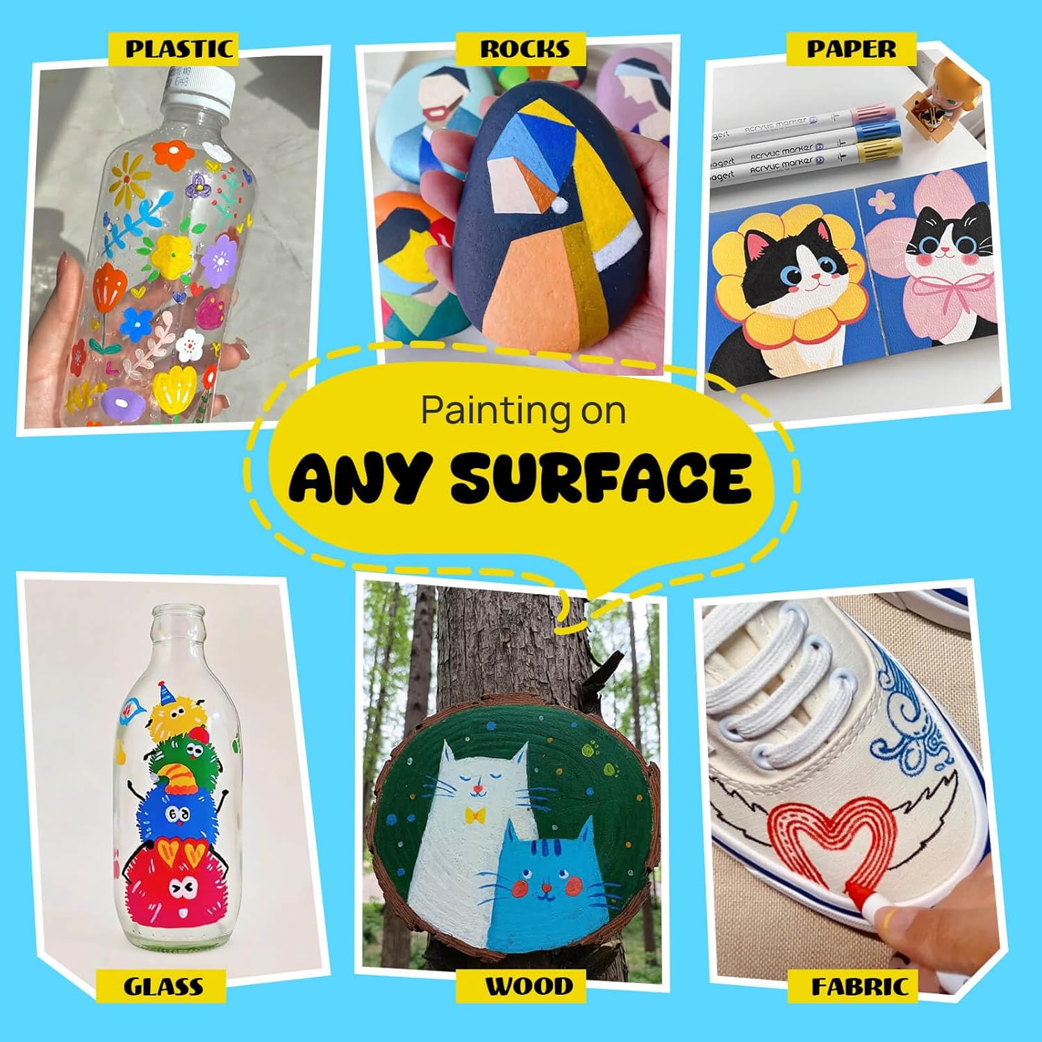- 【Suitable For Surfaces】 Acrylic paint marker set suitable for rock painting, ceramic, wood, fabric, stone, metal, plastic, canvas, resin, shoe, egg, calligraphy, scrapbook, paper, sneaker, clothes, models, leather, porcelain, dishwasher, posters, epoxy, brush lettering, mug painting, glass paints for glass painting, Christmas ornament, Halloween pumpkin painting, enjoy creating DIY art crafts graffiti projects on a variety of surfaces.