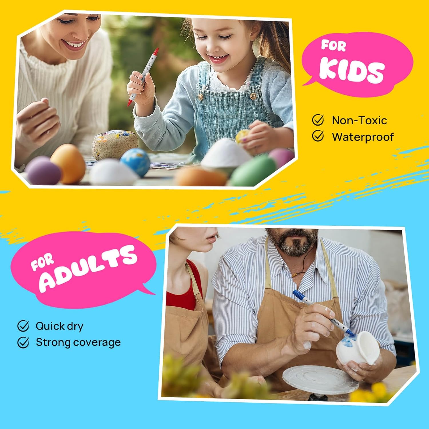 - 【Suitable For Surfaces】 Acrylic paint marker set suitable for rock painting, ceramic, wood, fabric, stone, metal, plastic, canvas, resin, shoe, egg, calligraphy, scrapbook, paper, sneaker, clothes, models, leather, porcelain, dishwasher, posters, epoxy, brush lettering, mug painting, glass paints for glass painting, Christmas ornament, Halloween pumpkin painting, enjoy creating DIY art crafts graffiti projects on a variety of surfaces.