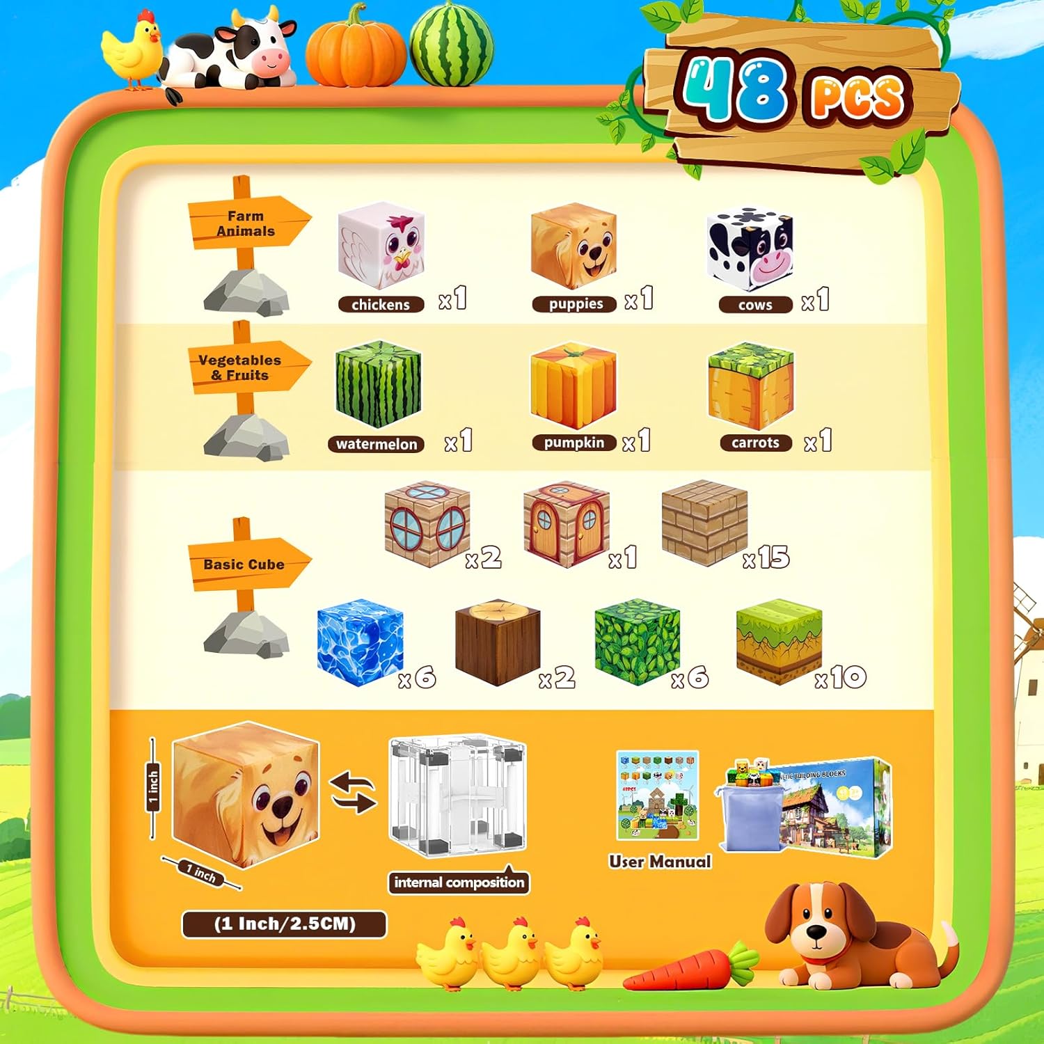 - REFUSE MONOTONOUS BUILDING EXPERIENCE: Worried that your child will soon get bored of traditional building blocks? Choose our magnetic building blocks! This 48pcs farm themed magnetic block contains different elements such as puppies, cows, chicks, pumpkins, watermelons and more, so that creative building will never be repeated! Our 1-inch magnetic blocks fit seamlessly with popular brands on the market, expanding multiple models with ease, and each magnetic cube sparks your child's imagination in a whole new way