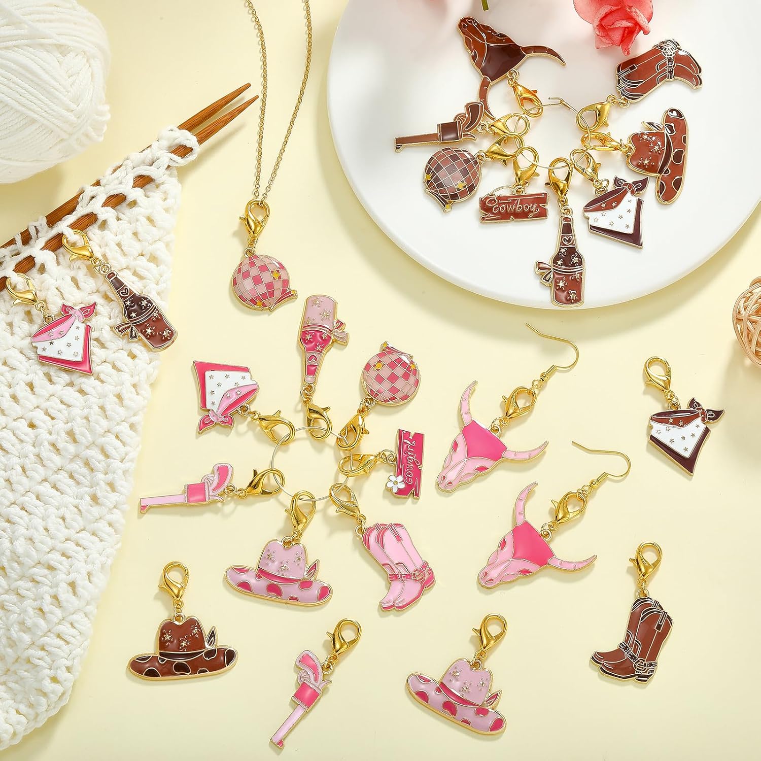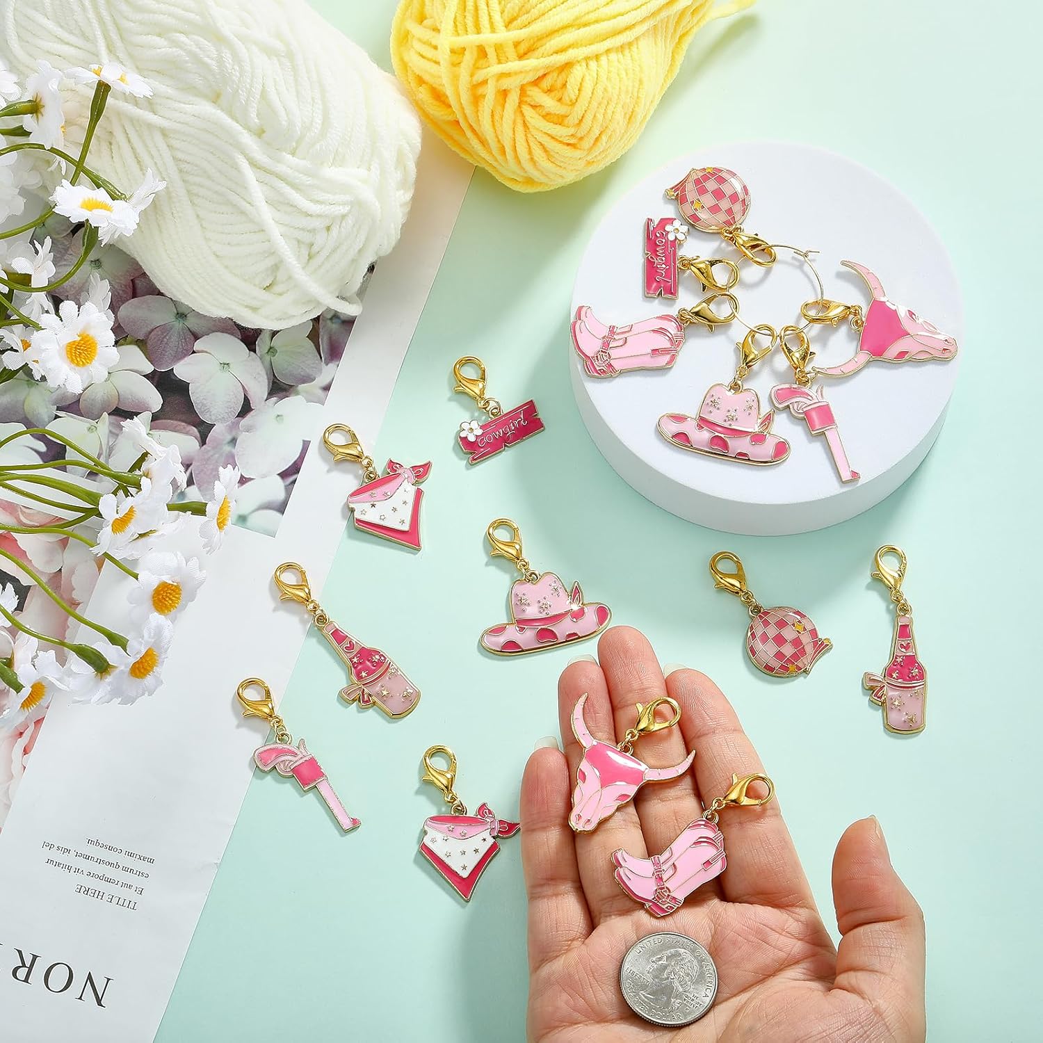 BEEFLYING 16Pcs Cowgirl Stitch Marker Charms for Crocheting and Knitting, 8 Styles Locking Pink Enemal Crochet Knit Stitch Marker Pendant with Leverback Clasp for Knitting Crocheting Accessories