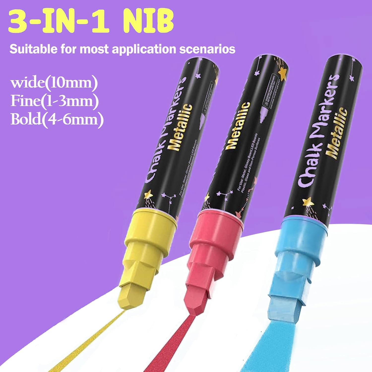 - 10MM Car Window Markers: Whether you want to send a special message or customize your car, 8 Jumbo liquid chalk markers will get the job done well. Each marker features a 10mm 3-in-1 large nib and vibrant neon colors. 3 in one Nib - The Rectangular Tip enables you to use the Markers as 3 Tips - Wide Lines, bold lines & thin fine lines, making these chalk markers versatile for all your painting needs.