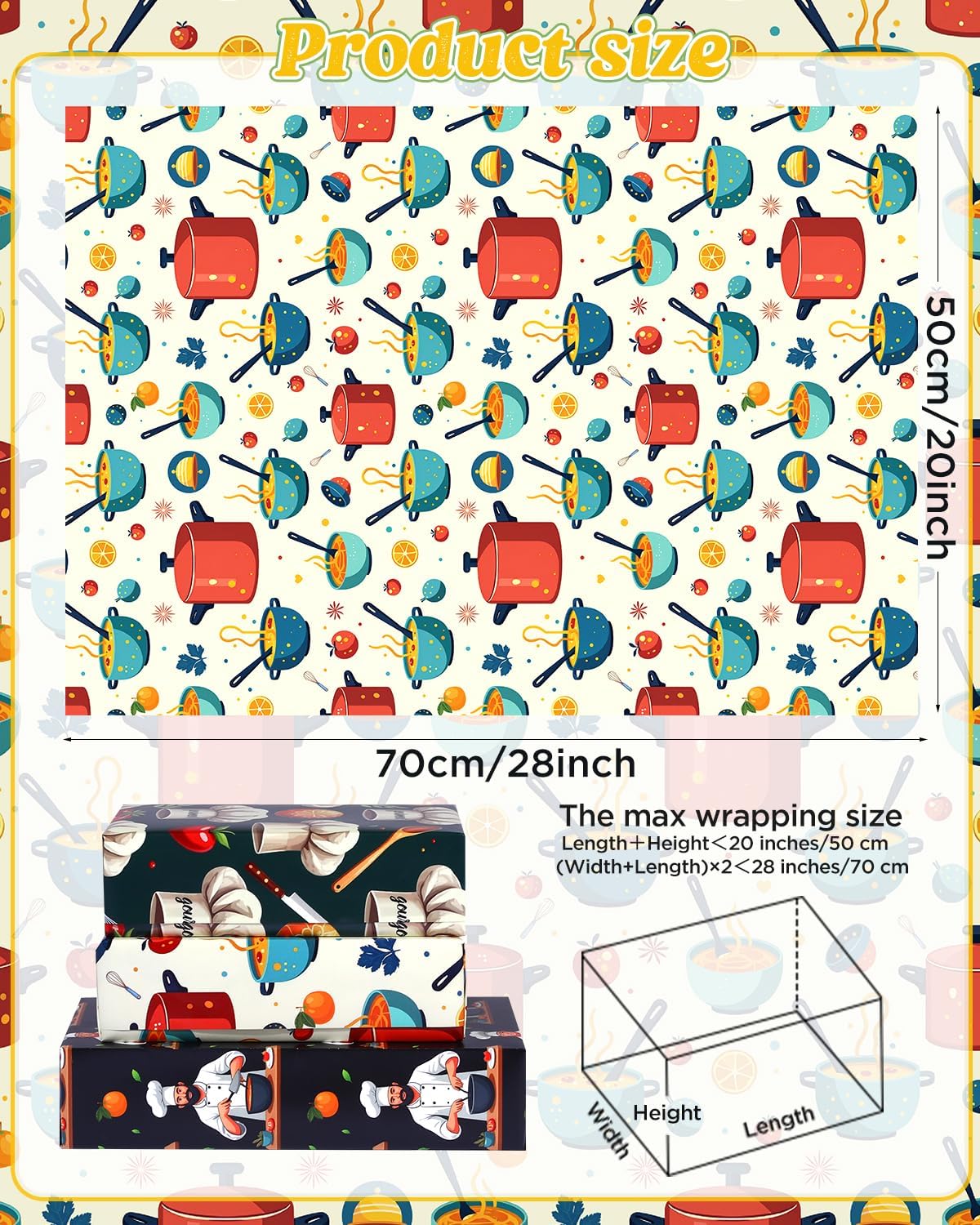 - PACKAGE INCLUDES: This charming cooking-themed wrapping paper set includes 12 sheets of delightful wrapping paper, perfect for wrapping gifts, crafting, or adding a touch of culinary flair to any occasion. Wrap your presents with a dash of cooking joy using our unique design!