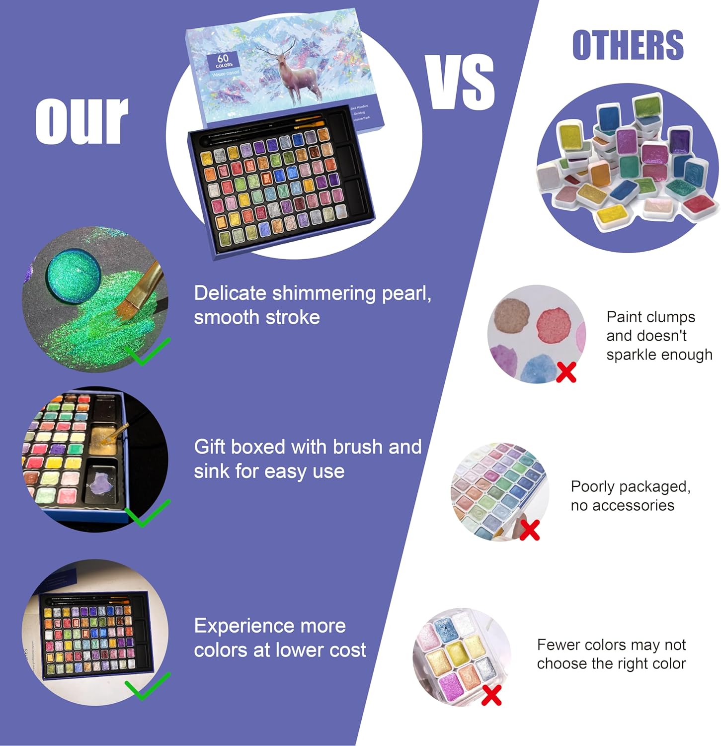 - Pearl Watercolor Paint Set - The GlisDyck professional watercolor kit features 60/108 vibrant colors with intense shimmer mineral pigments, Includes 2 brushes and 3 sinks. Metallic watercolor blend effortlessly, offering glitter effect on light/dark surfaces,Ideal for watercolor sets for adults &kids, the smooth formula dries quickly without clumping or flaking