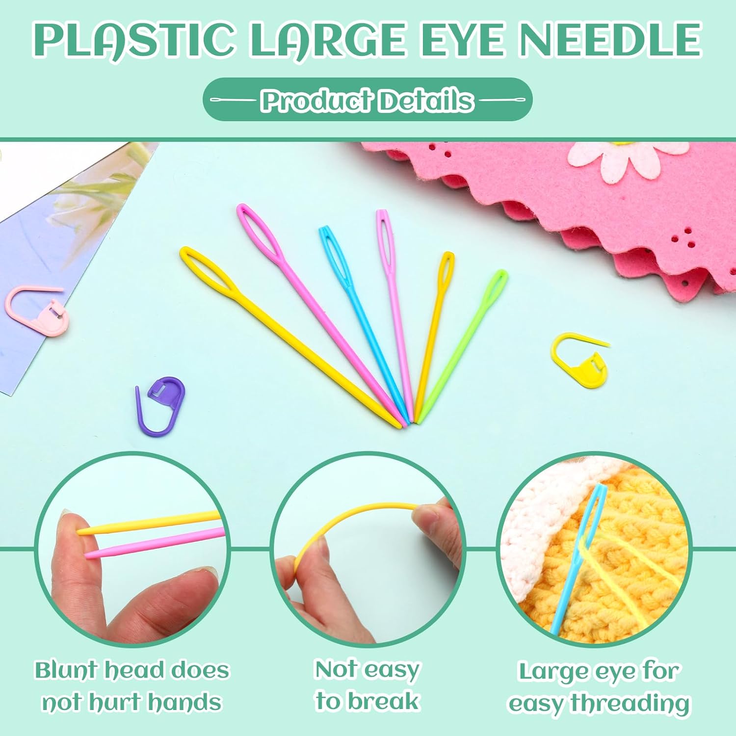 - Included Components : 200 plastic stitch needle clips (10 colors), 6 big eye plastic yarn needles, 1 storage box