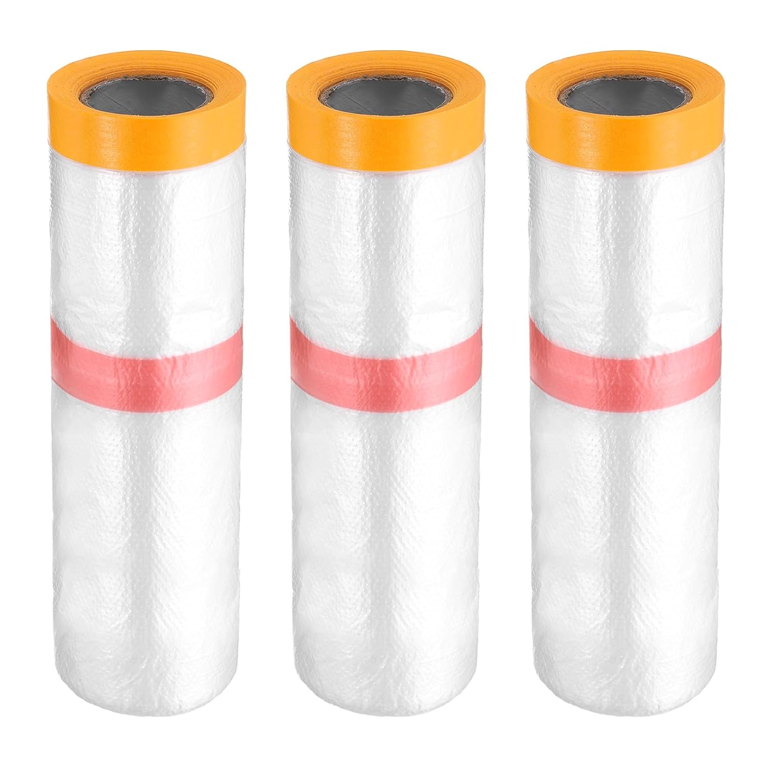 HARFINGTON 3 Rolls Pre-Taped Masking Film 106.3" x32.8ft Double Adhesive Tape and Drape Painters Plastic Drop Cloth Film with Tape Plastic Sheeting for Automotive Painting Covering